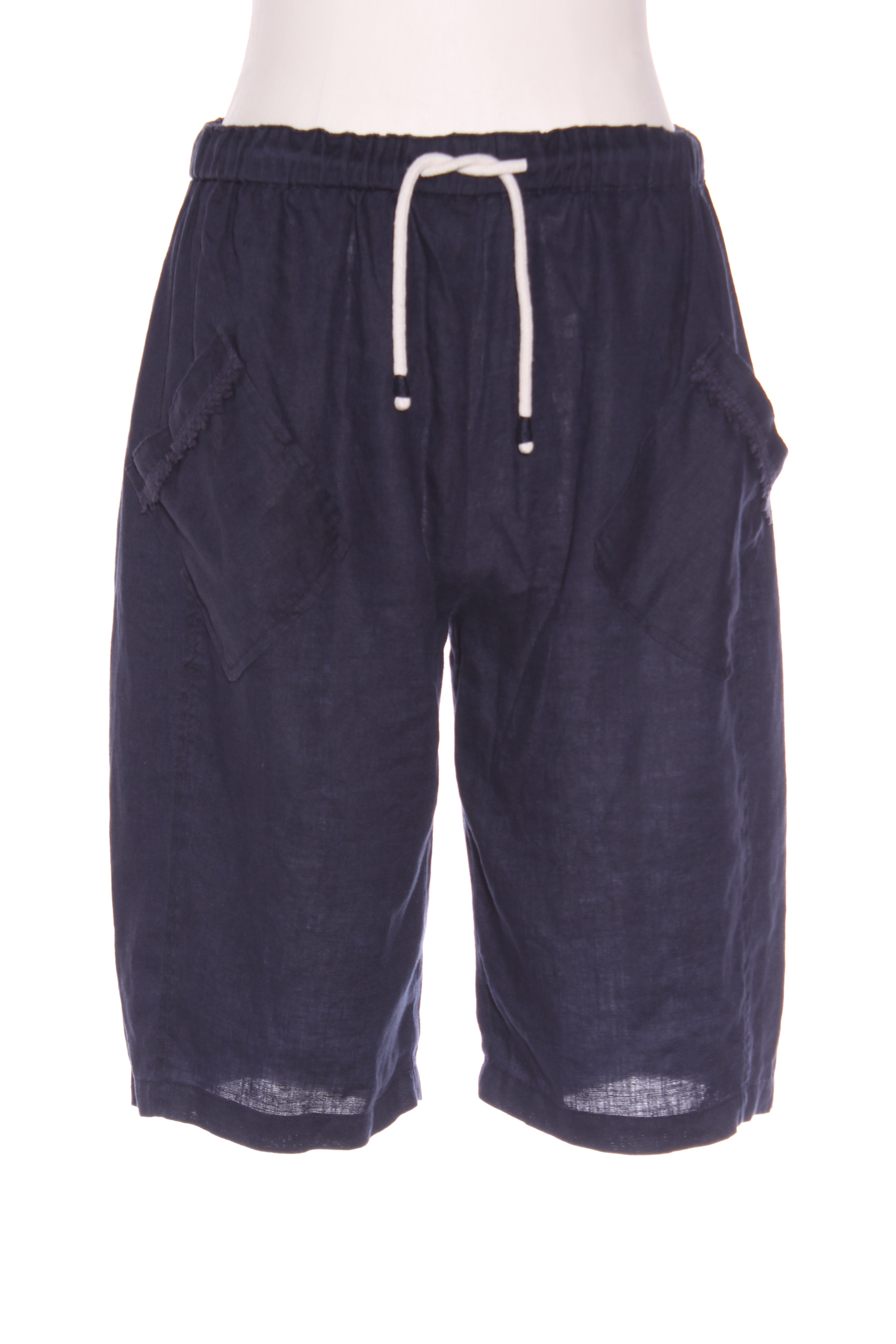 SIZE ON TAG: 10FITS LIKE: N/ACOLOUR: Navy blueFABRIC: LinenCONDITION: Excellent prelovedMEASUREMENTS:WAIST: 31cms HIPS: 62cms RISE: 31cms LENGTH: 28cms(From crotch to end of short)NOTES: Linen...