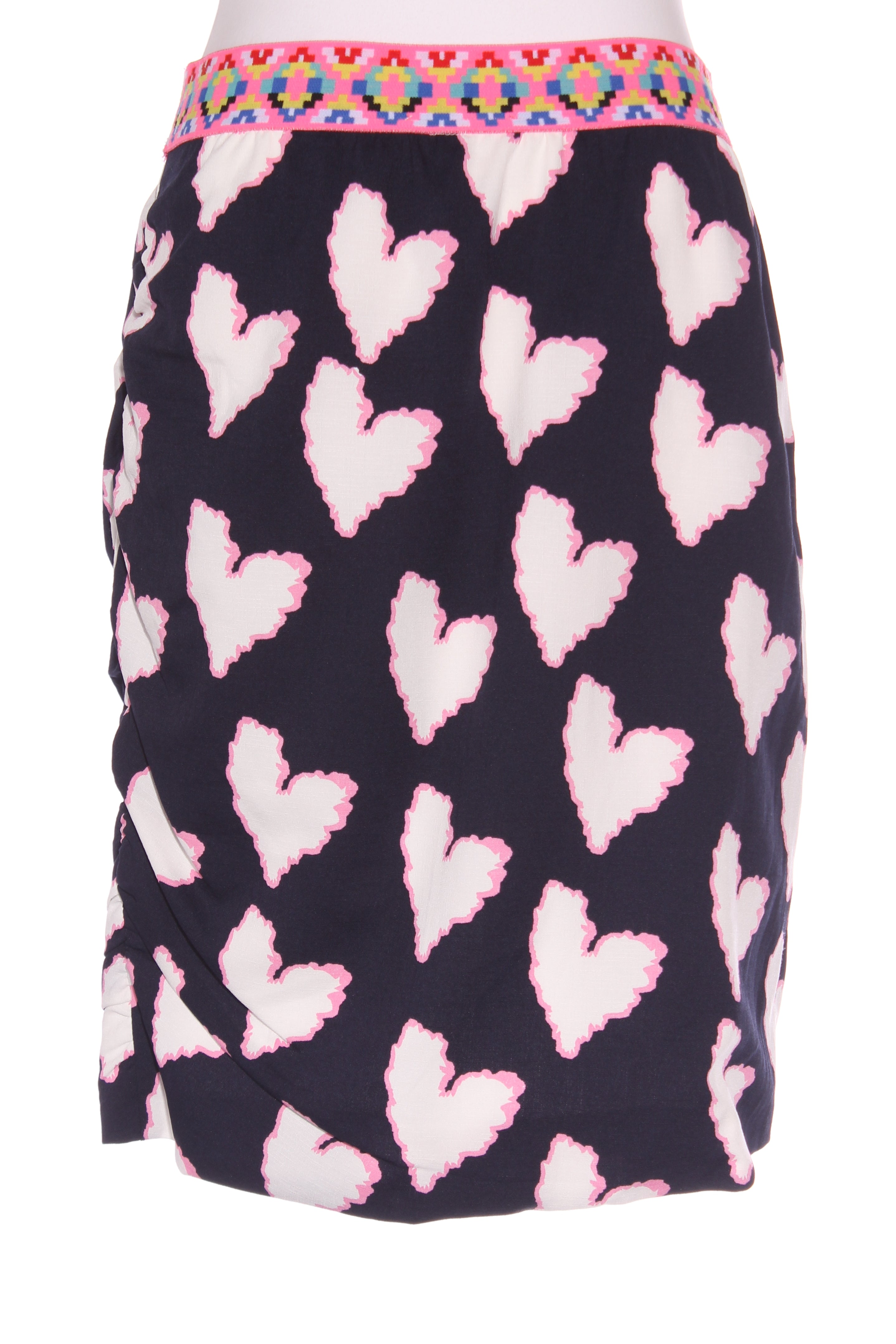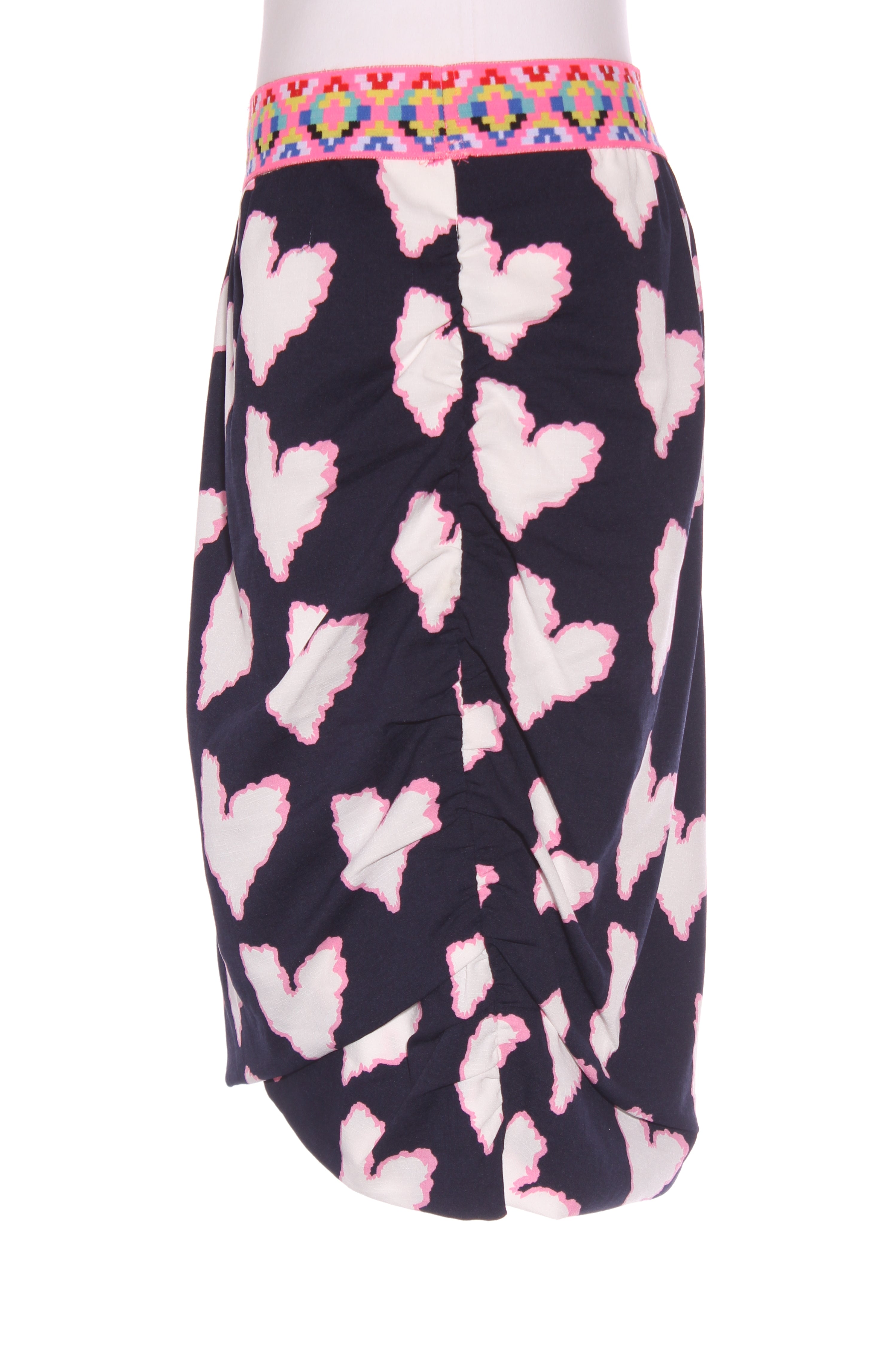 SIZE ON TAG: 14FITS LIKE: N/ACOLOUR: Navy blue, pink, multiFABRIC: PolyesterCONDITION: Excellent prelovedMEASUREMENTS:WAIST: 39cms HIPS: 54cms LENGTH: 52-59cms NOTES: Elasticated waist. Fully lined. Fabric has stretch. Gathered...