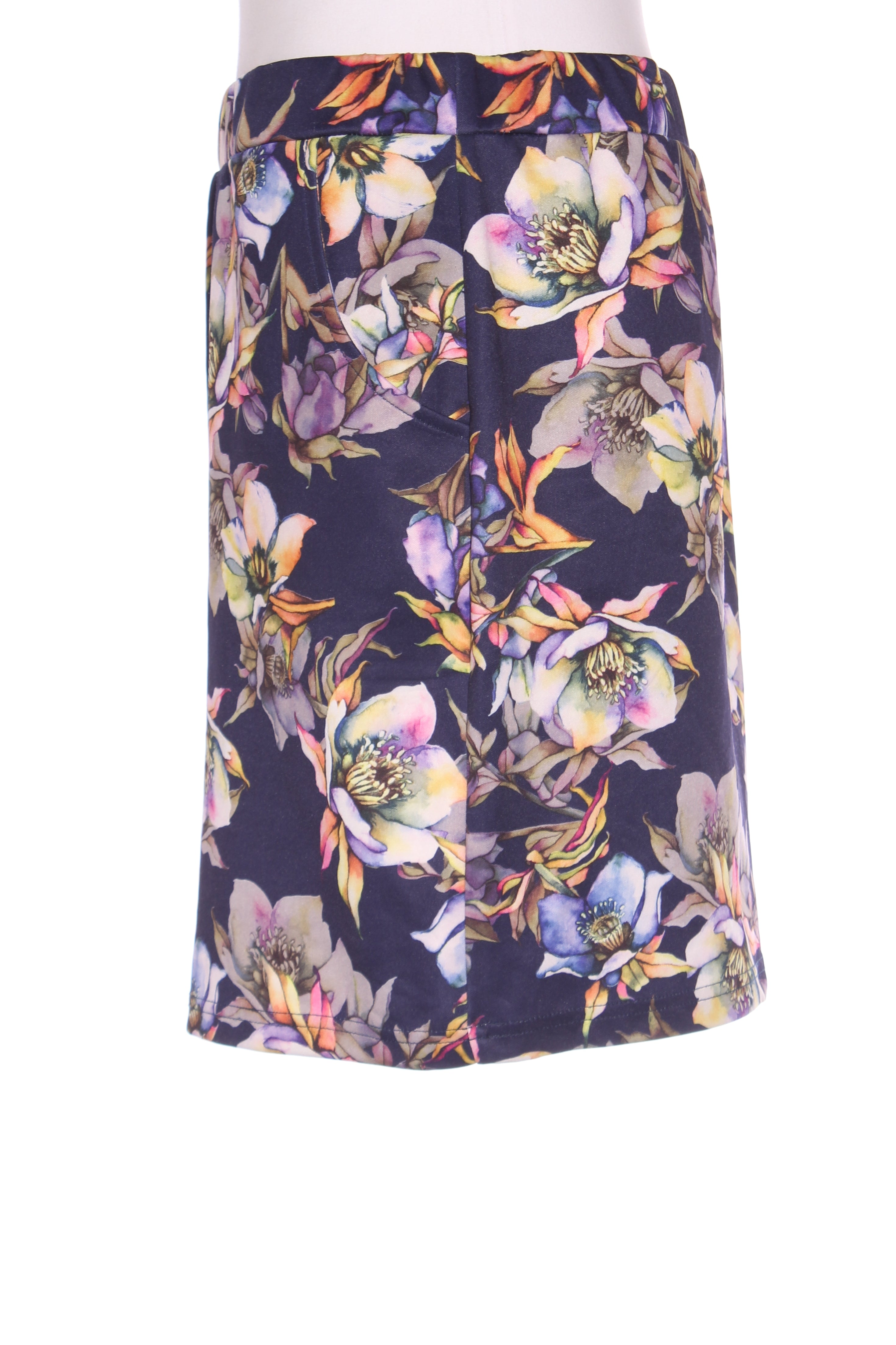 SIZE ON TAG: LFITS LIKE: 14COLOUR: Multi, navy blueFABRIC: 95% polyester, 5% elastaneCONDITION: Excellent prelovedMEASUREMENTS:WAIST: 39cms HIPS: 53cms LENGTH: 45cms NOTES: Elasticated waist. Side pockets. Fabric has...