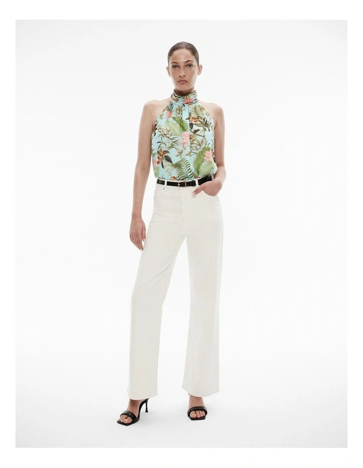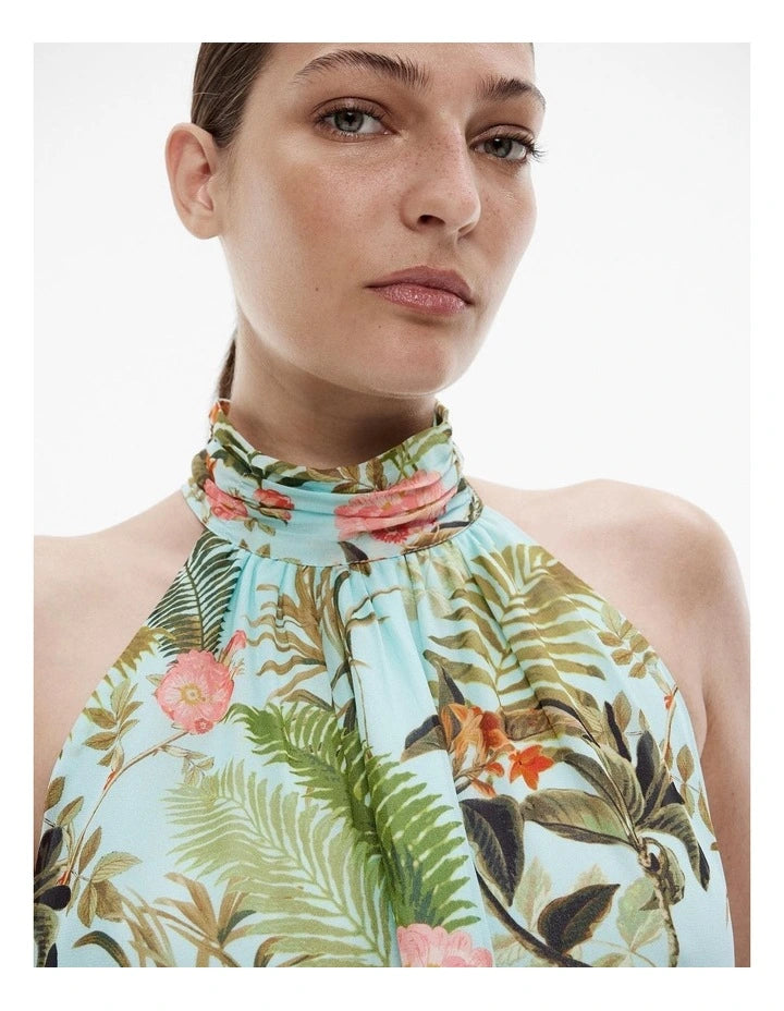 SIZE ON TAG: 12FITS LIKE: N/ACOLOUR: MultiFABRIC: Viscose, Lining - polyesterCONDITION: Excellent prelovedMEASUREMENTS:BUST: 61cms WAIST: 64cms LENGTH: 62-70cmsNOTES: Features an all-over tropical print in baby blue,...