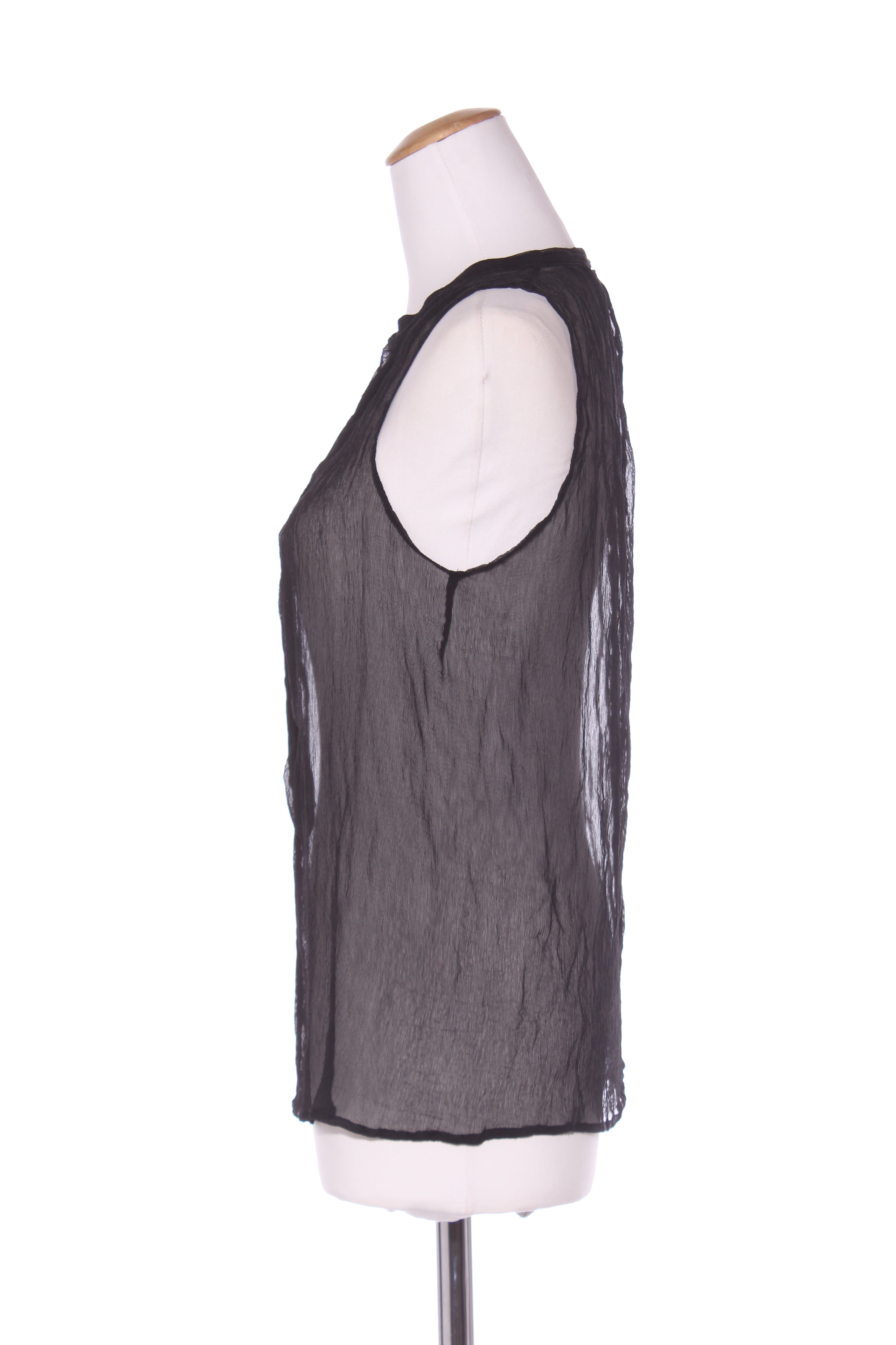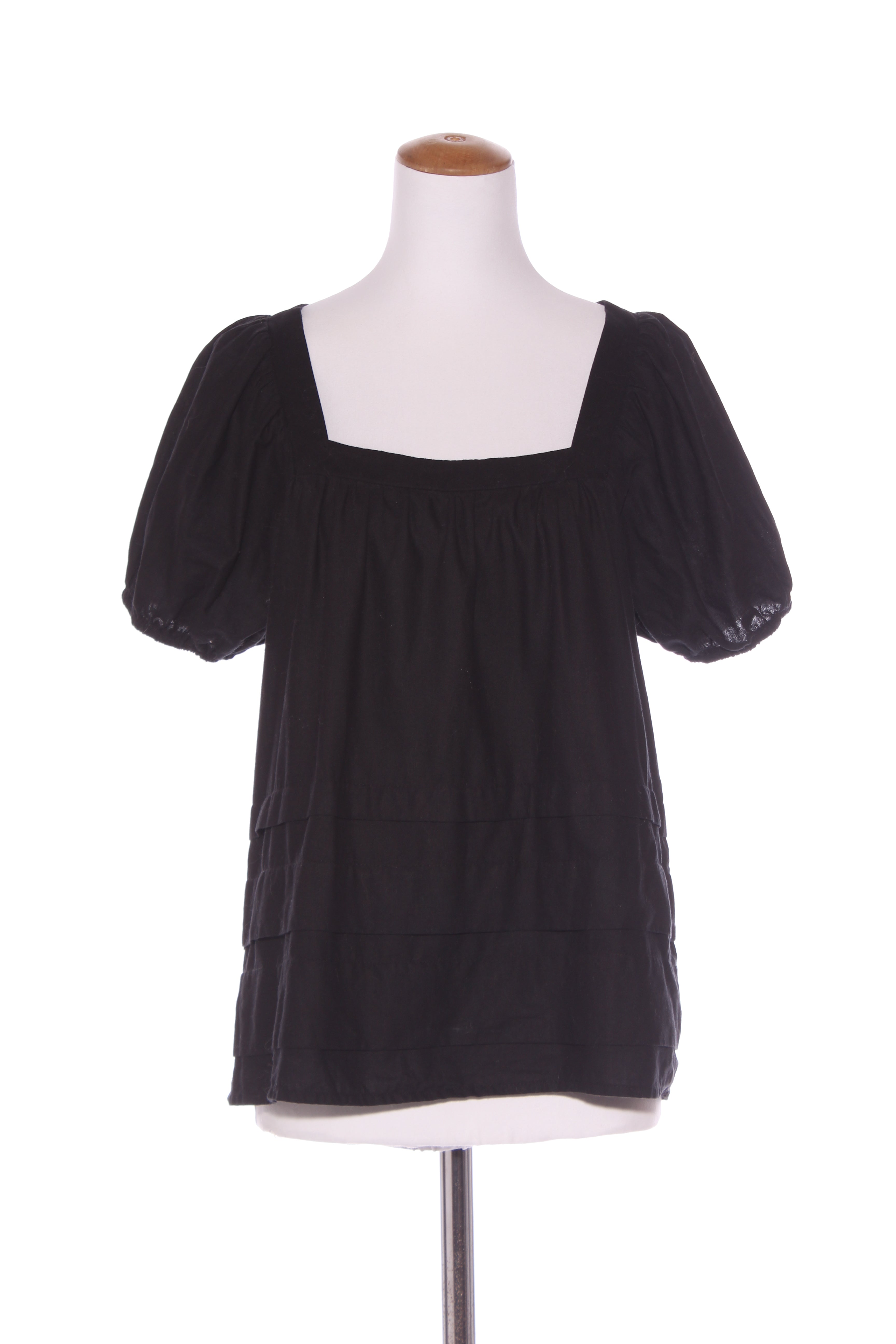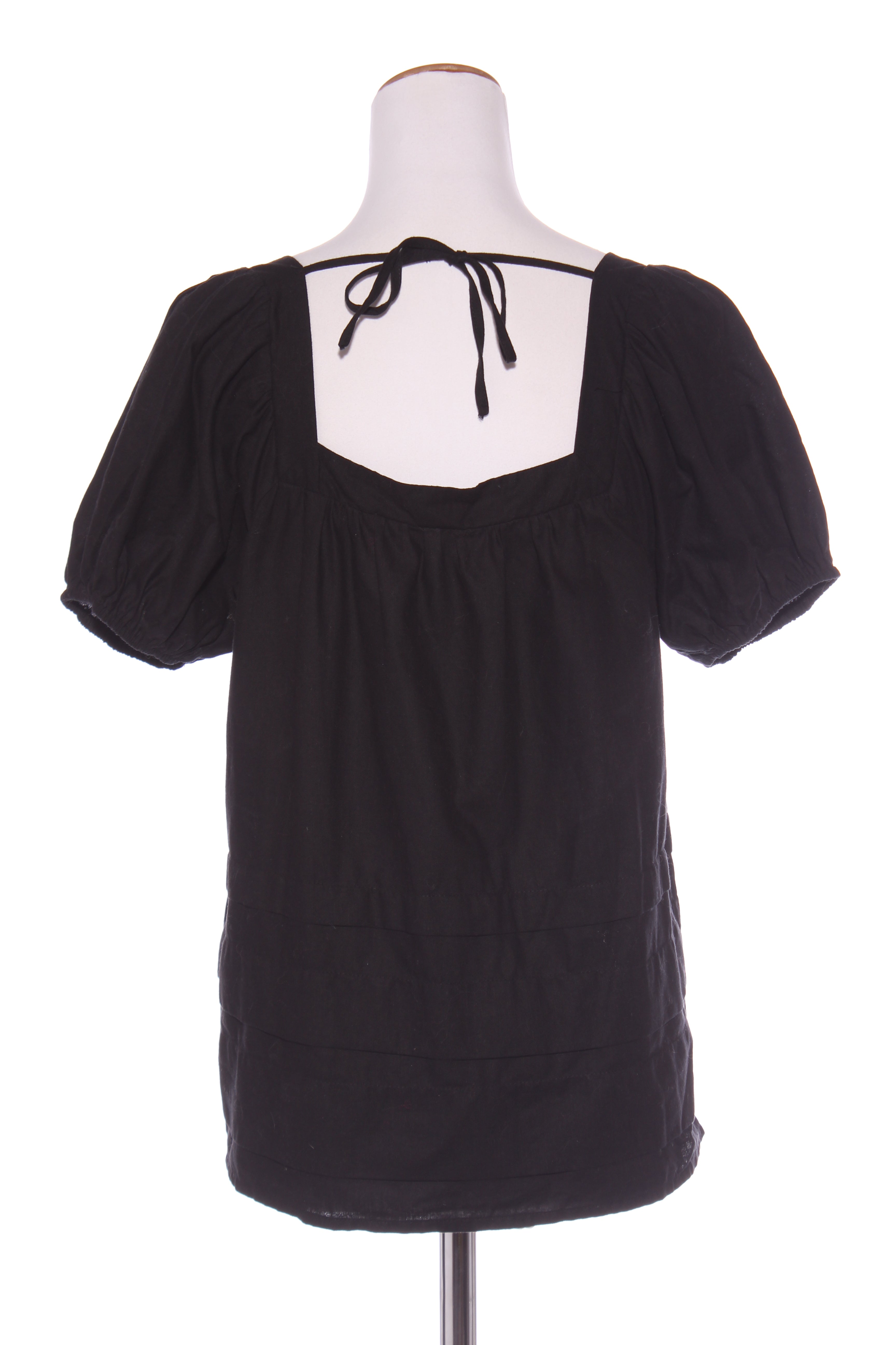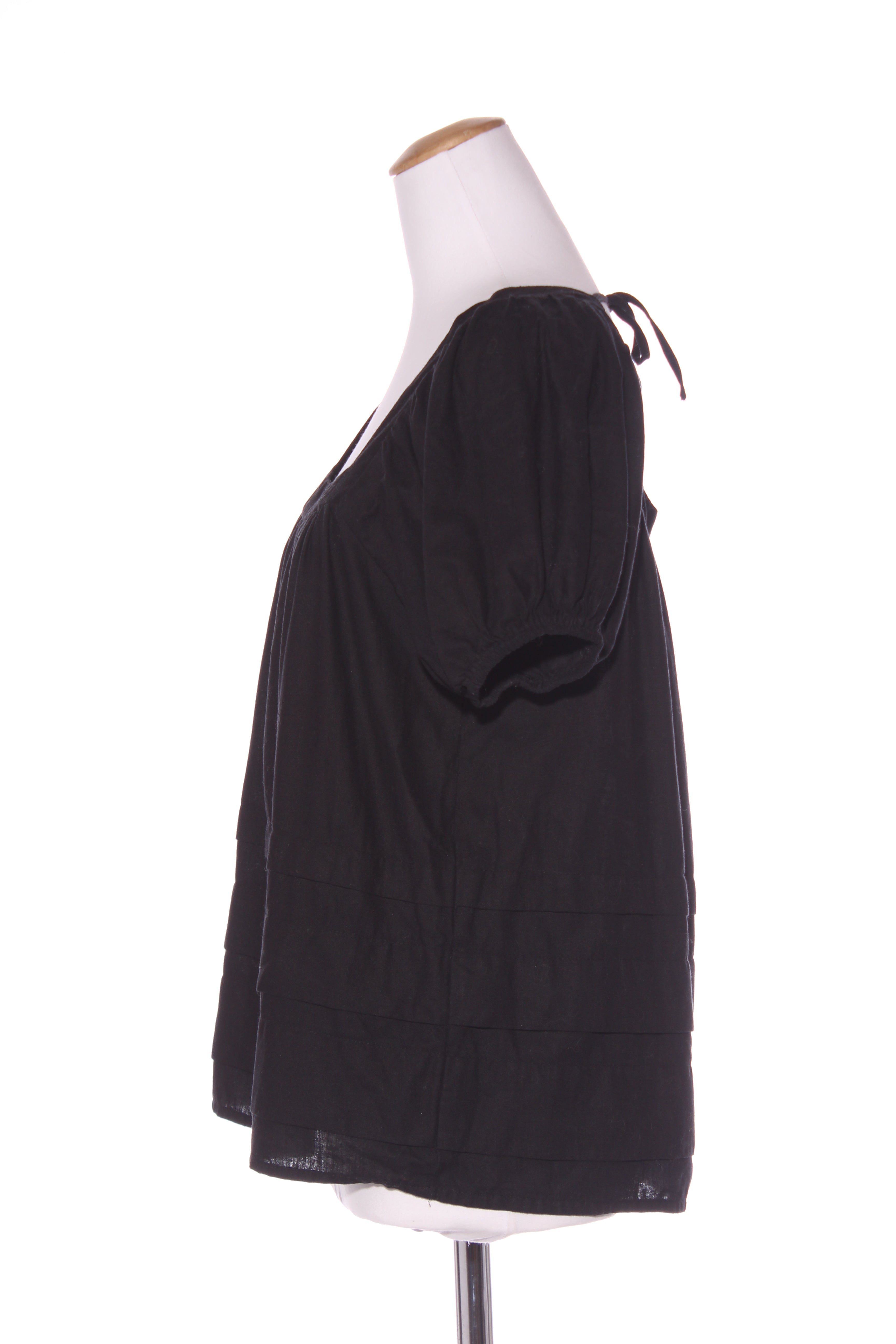 SIZE ON TAG: XSFITS LIKE: 8-10COLOUR: BlackFABRIC: 70% cotton, 30% linenCONDITION: Excellent prelovedMEASUREMENTS:BUST: 51cms WAIST: 57cms LENGTH: 66cms NOTES: Ties at nape of neck. Elasticated sleeve ends.