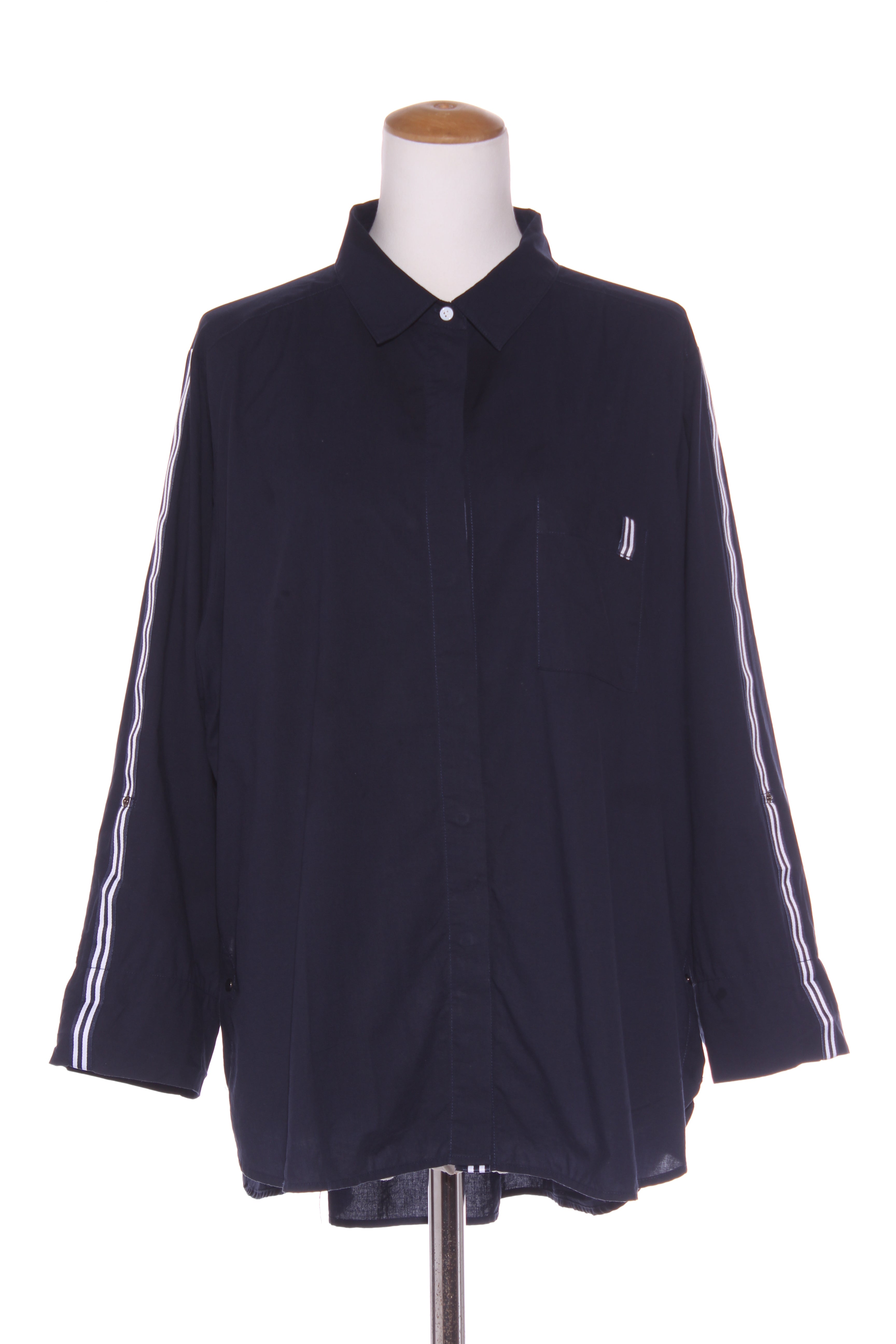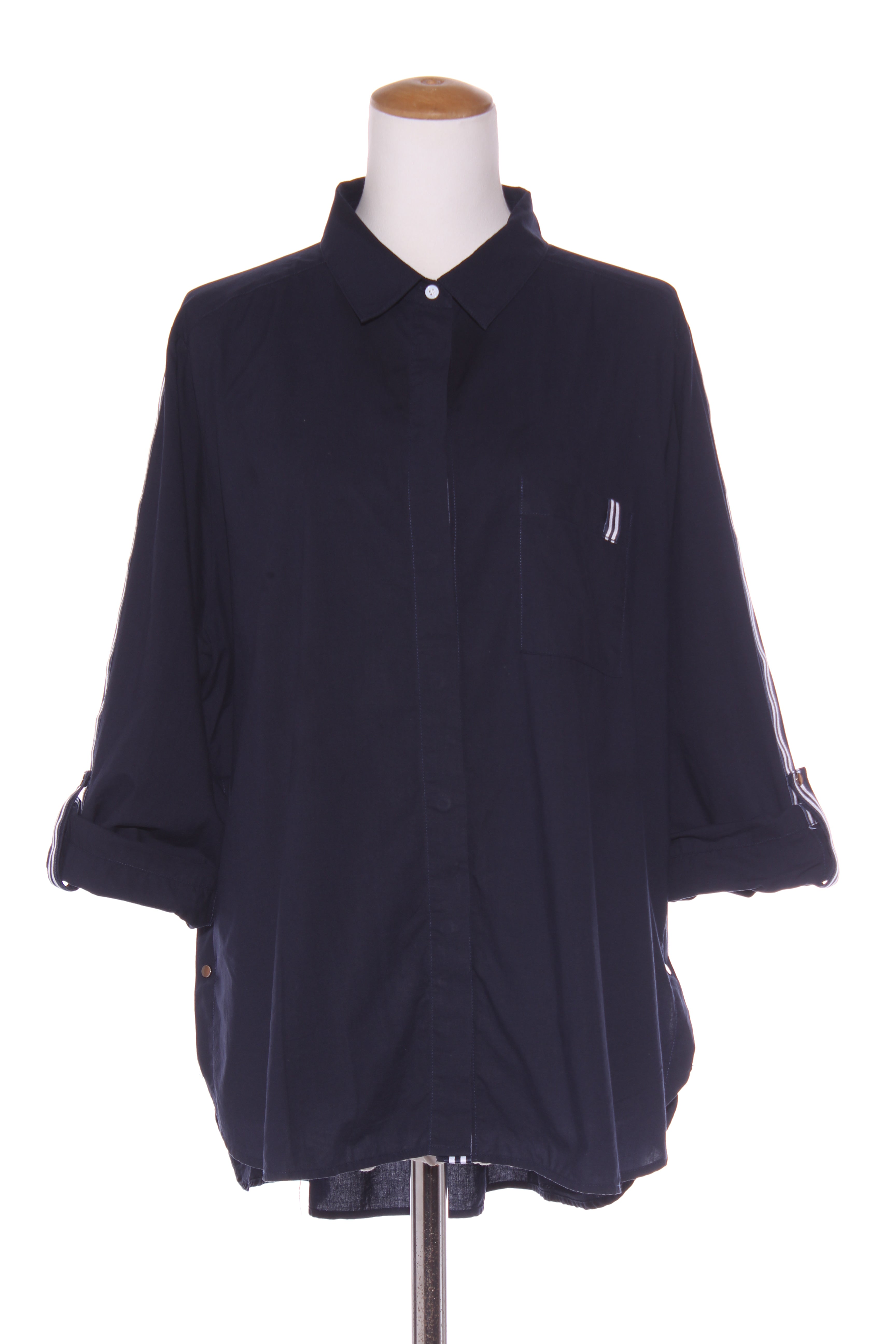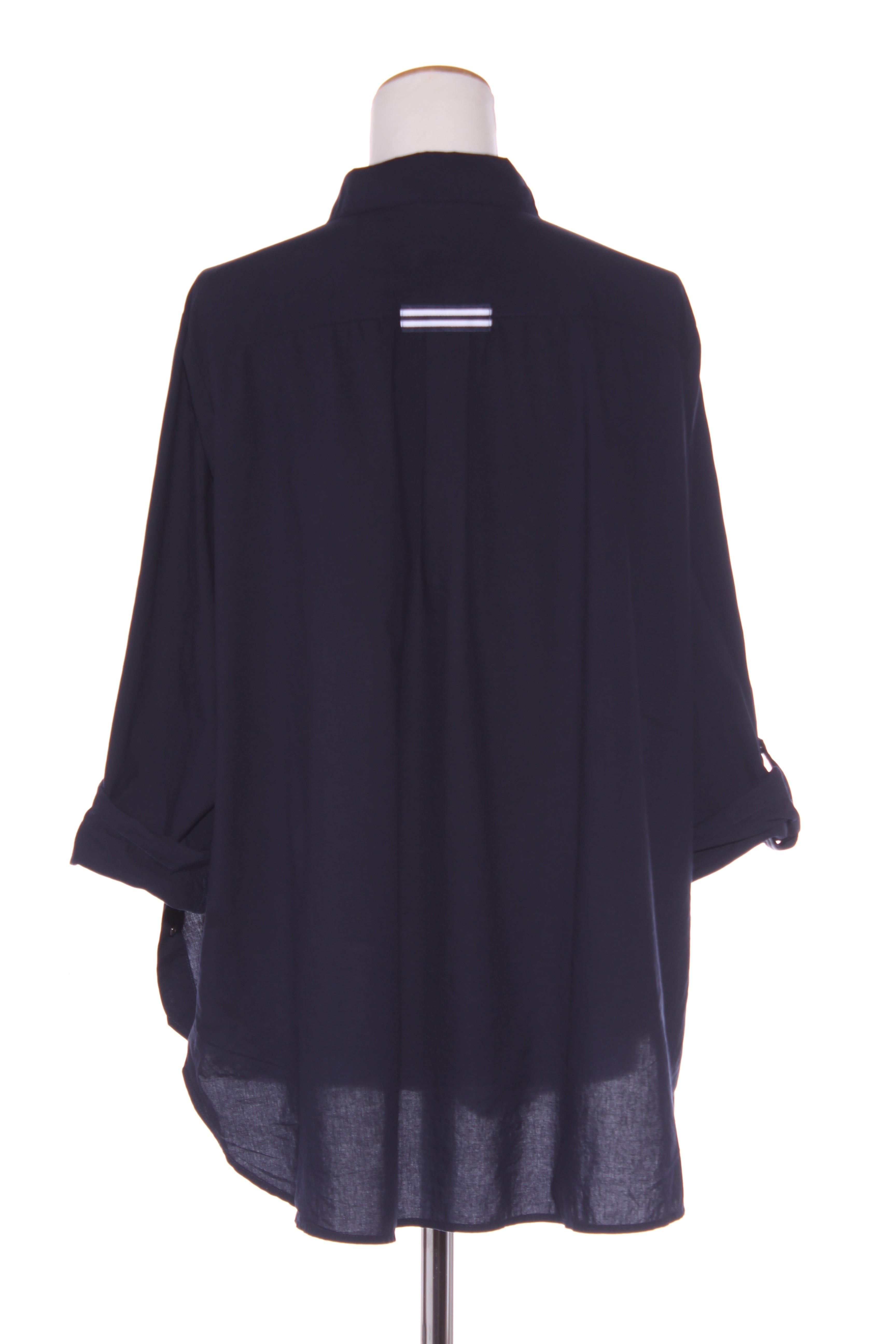 SIZE ON TAG: 14FITS LIKE: 14COLOUR: Navy blue, whiteFABRIC: 98% cotton, 2% polyurethaneCONDITION: Excellent prelovedMEASUREMENTS:BUST: 65cms WAIST: 64cms LENGTH: 67cmsNOTES: Our Ginsberg Shirt is a proven winning...