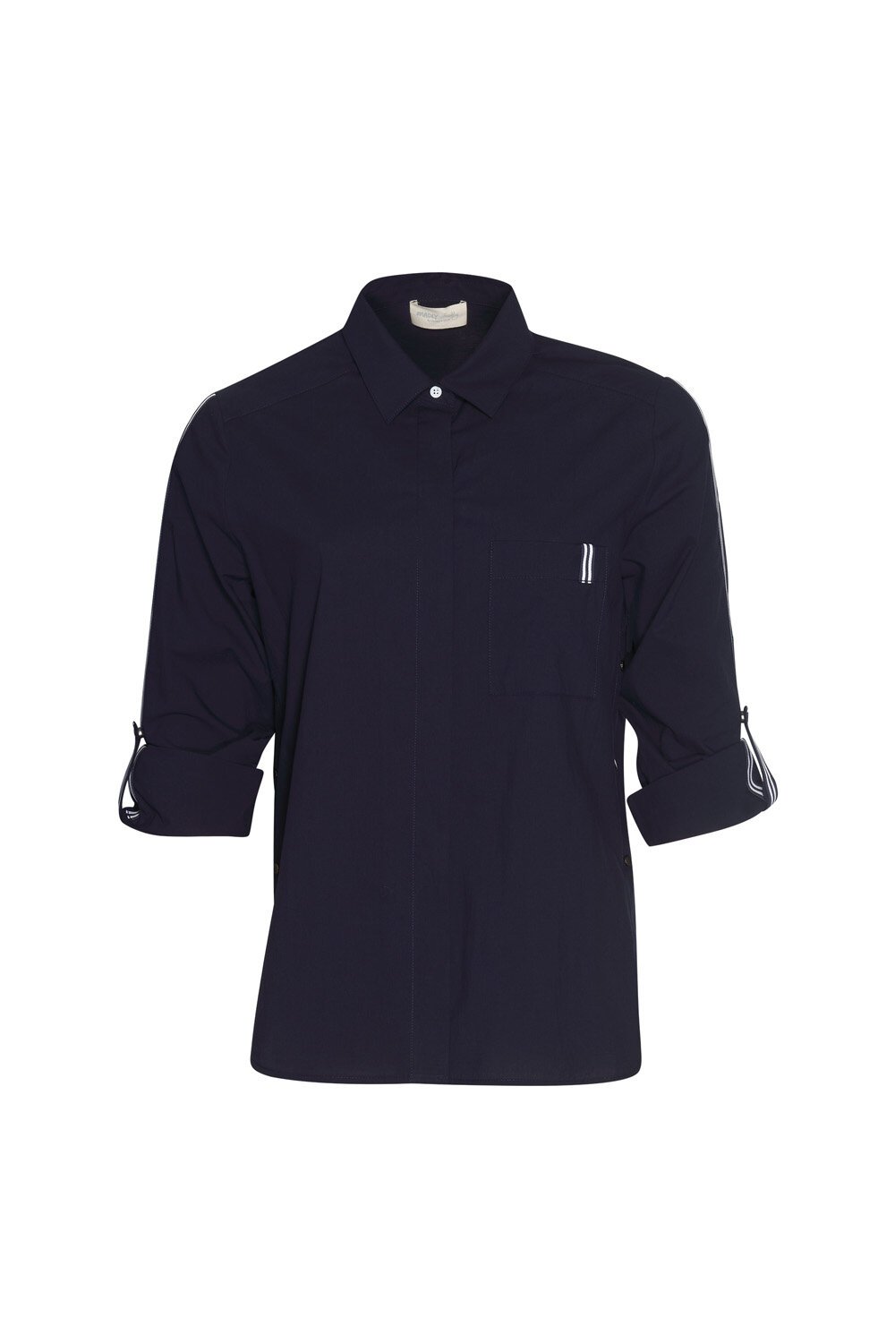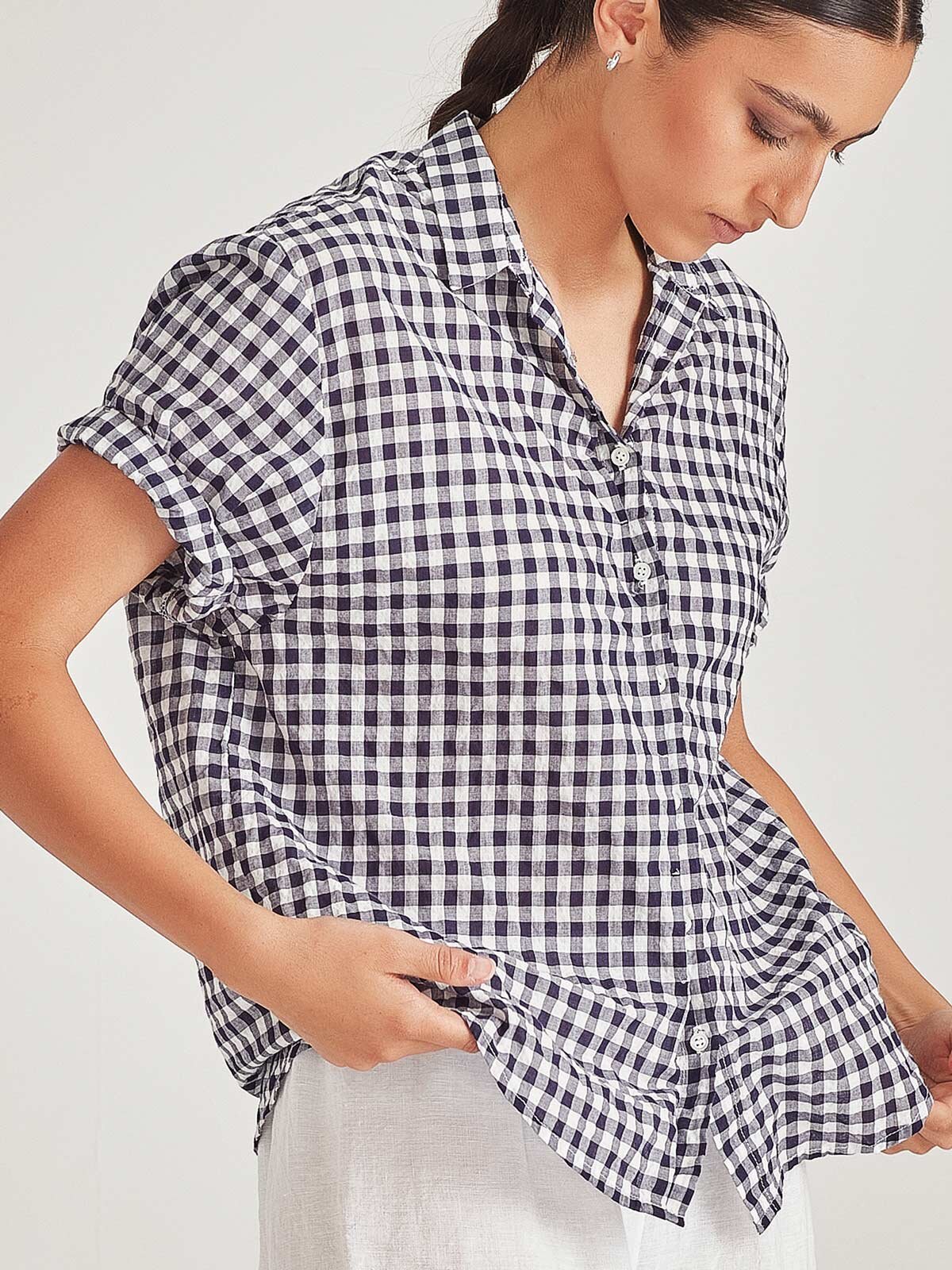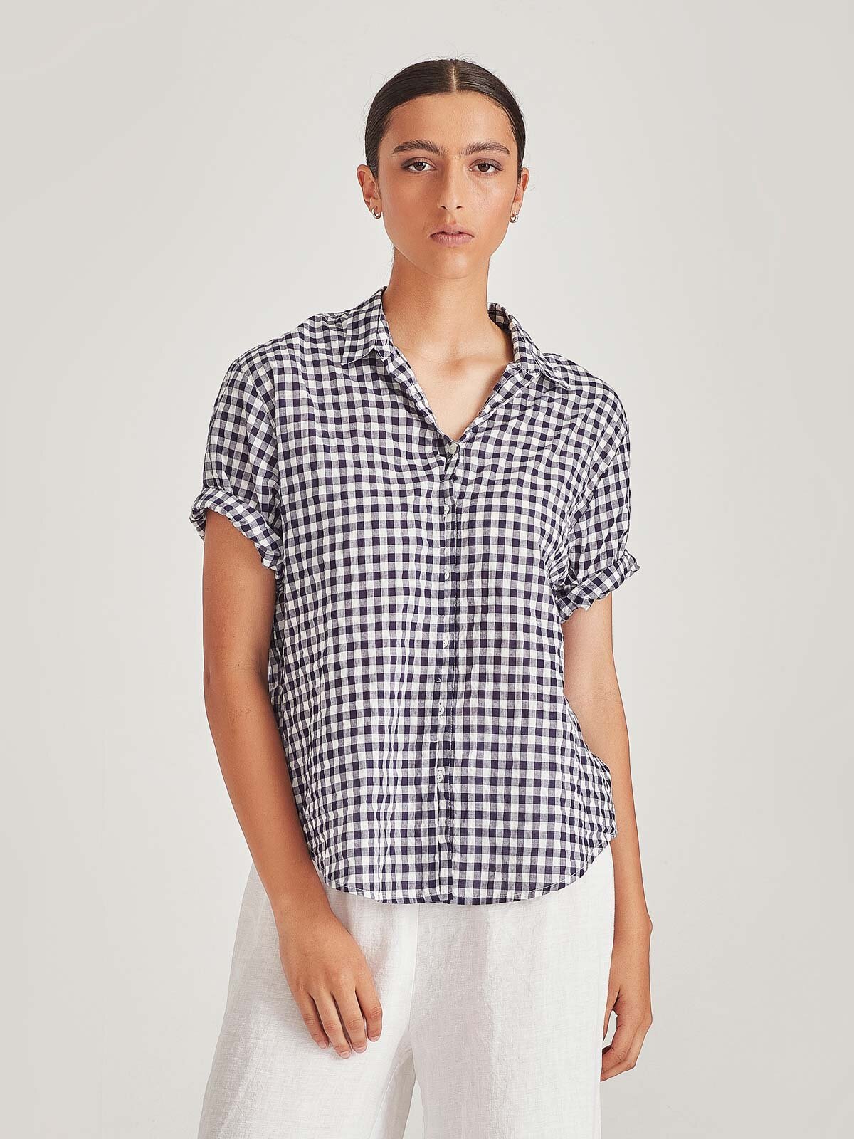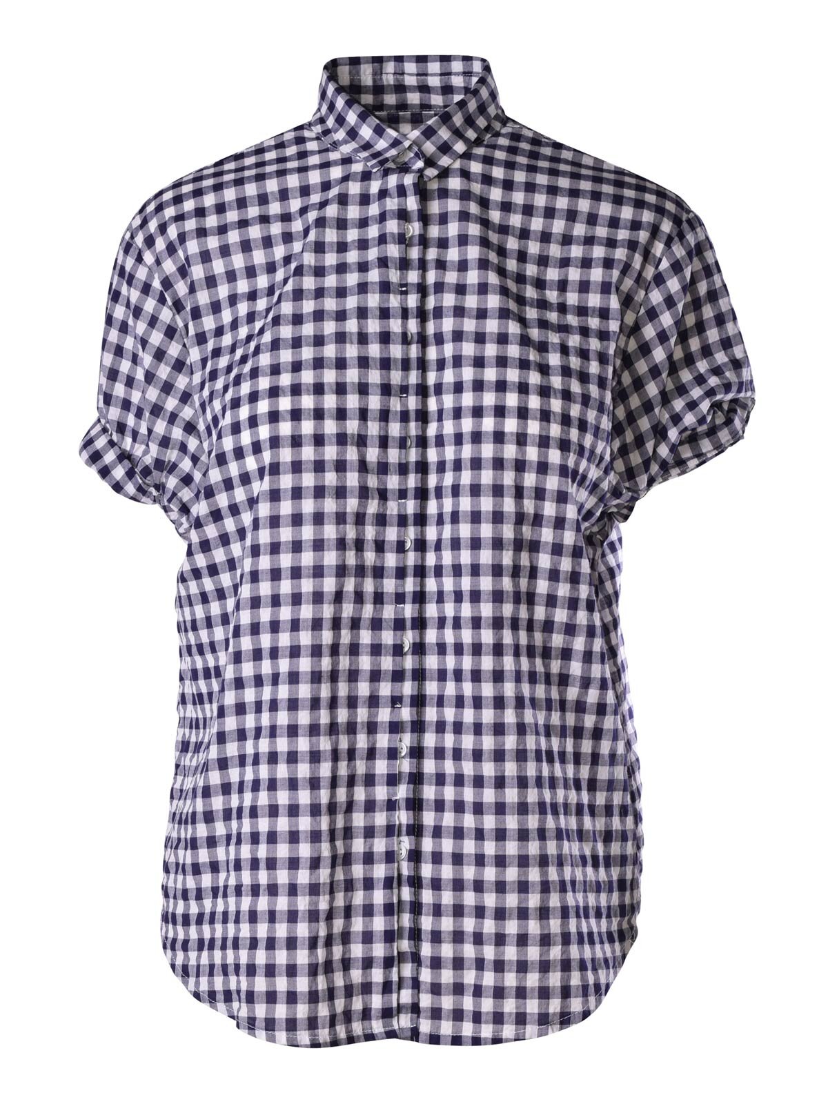 SIZE ON TAG: 14FITS LIKE: 14COLOUR: Navy blue, whiteFABRIC: 98% cotton, 2% polyurethaneCONDITION: Excellent prelovedMEASUREMENTS:BUST: 65cms WAIST: 64cms LENGTH: 67cmsNOTES: Our Ginsberg Shirt is a proven winning...