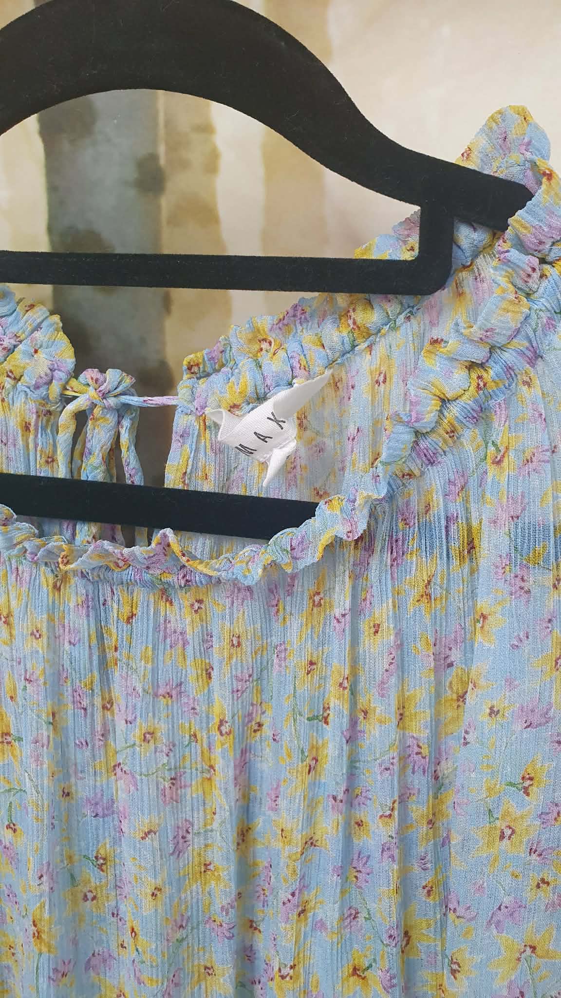 SIZE ON TAG: 14FITS LIKE: N/ACOLOUR: Blue, yellow, pinkFABRIC: Viscose CONDITION: Excellent prelovedMEASUREMENTS:BUST: 68cms WAIST: 63cms LENGTH: 55-59cmsNOTES: Ties at nape of neck. Elasticated neckline and billow...