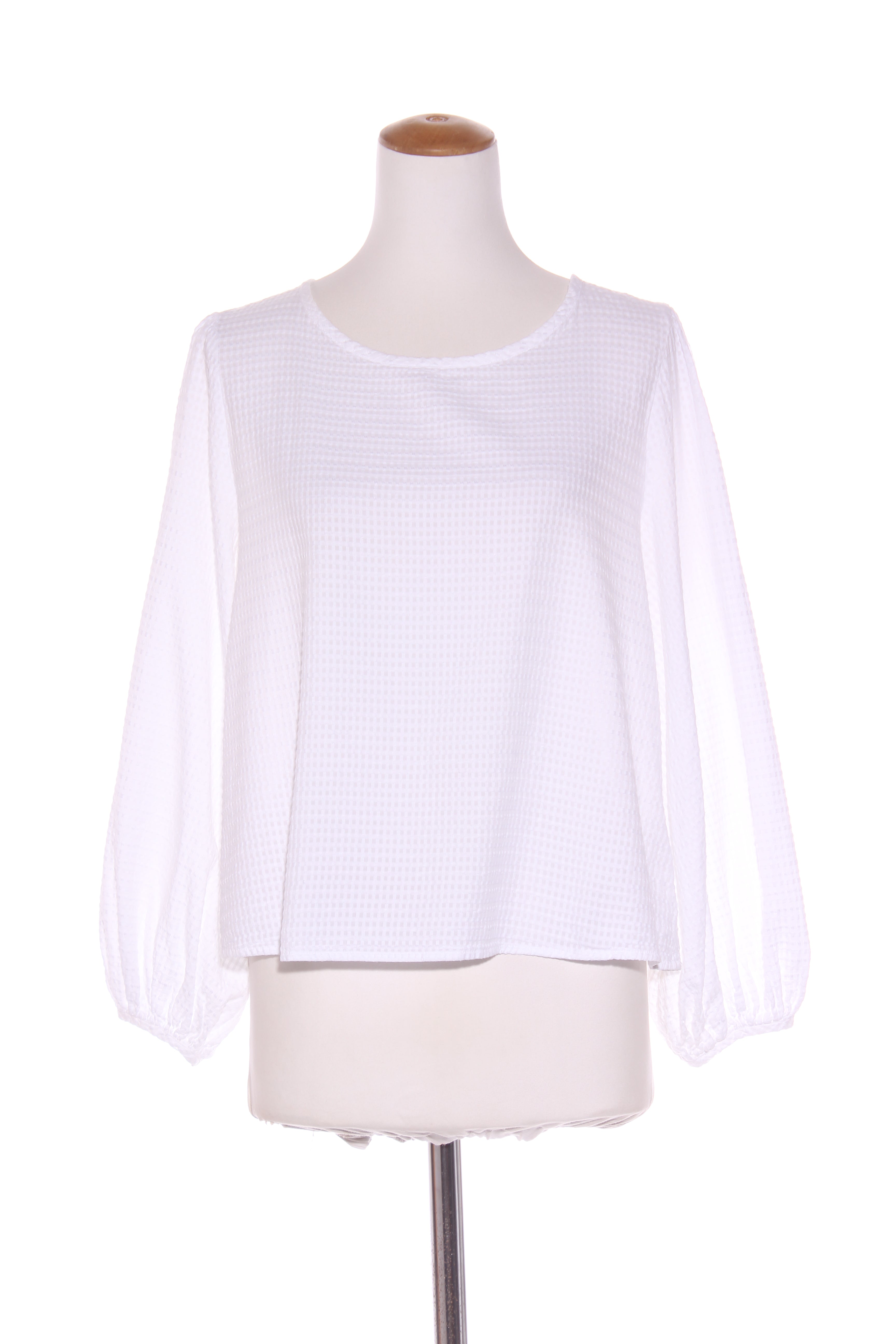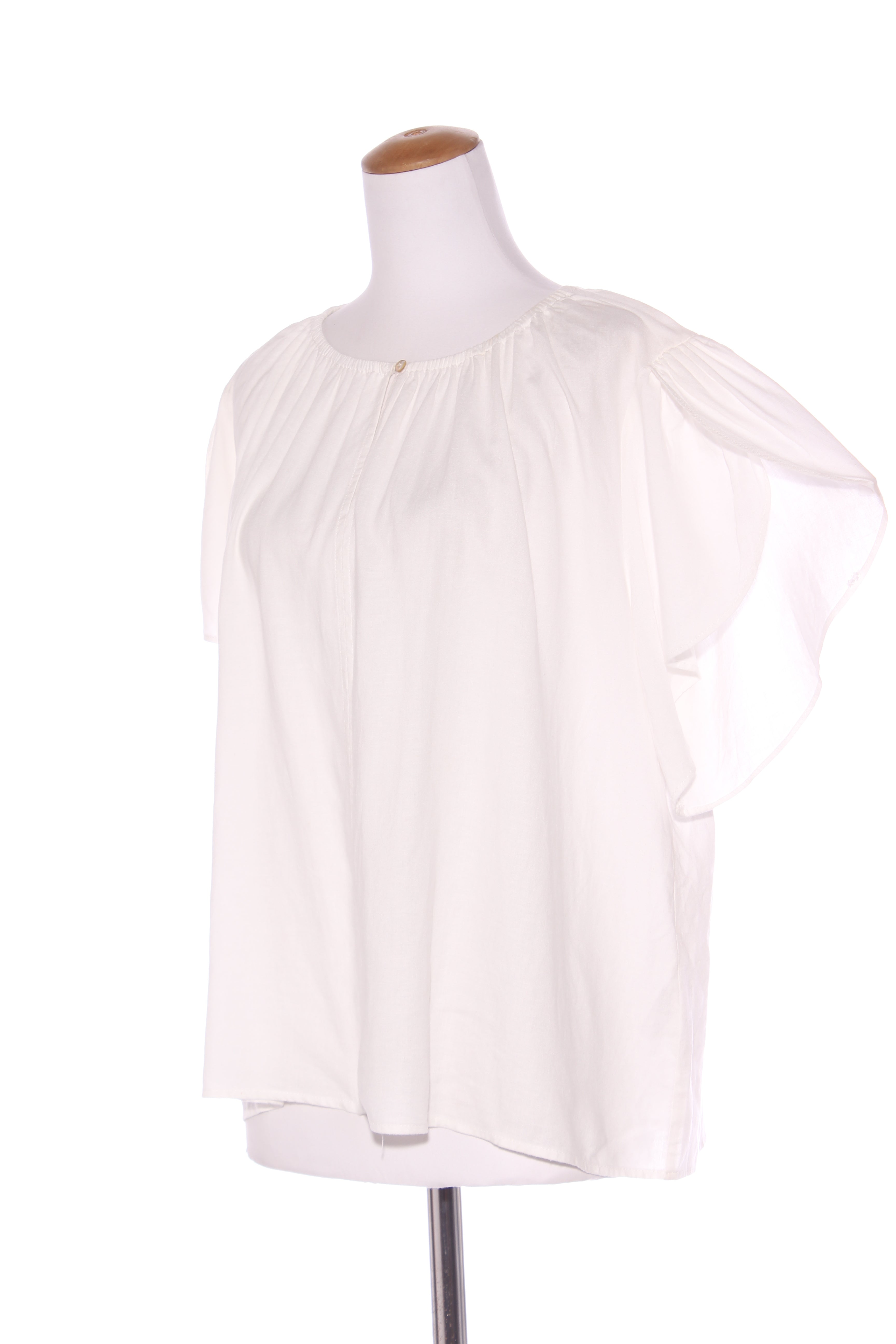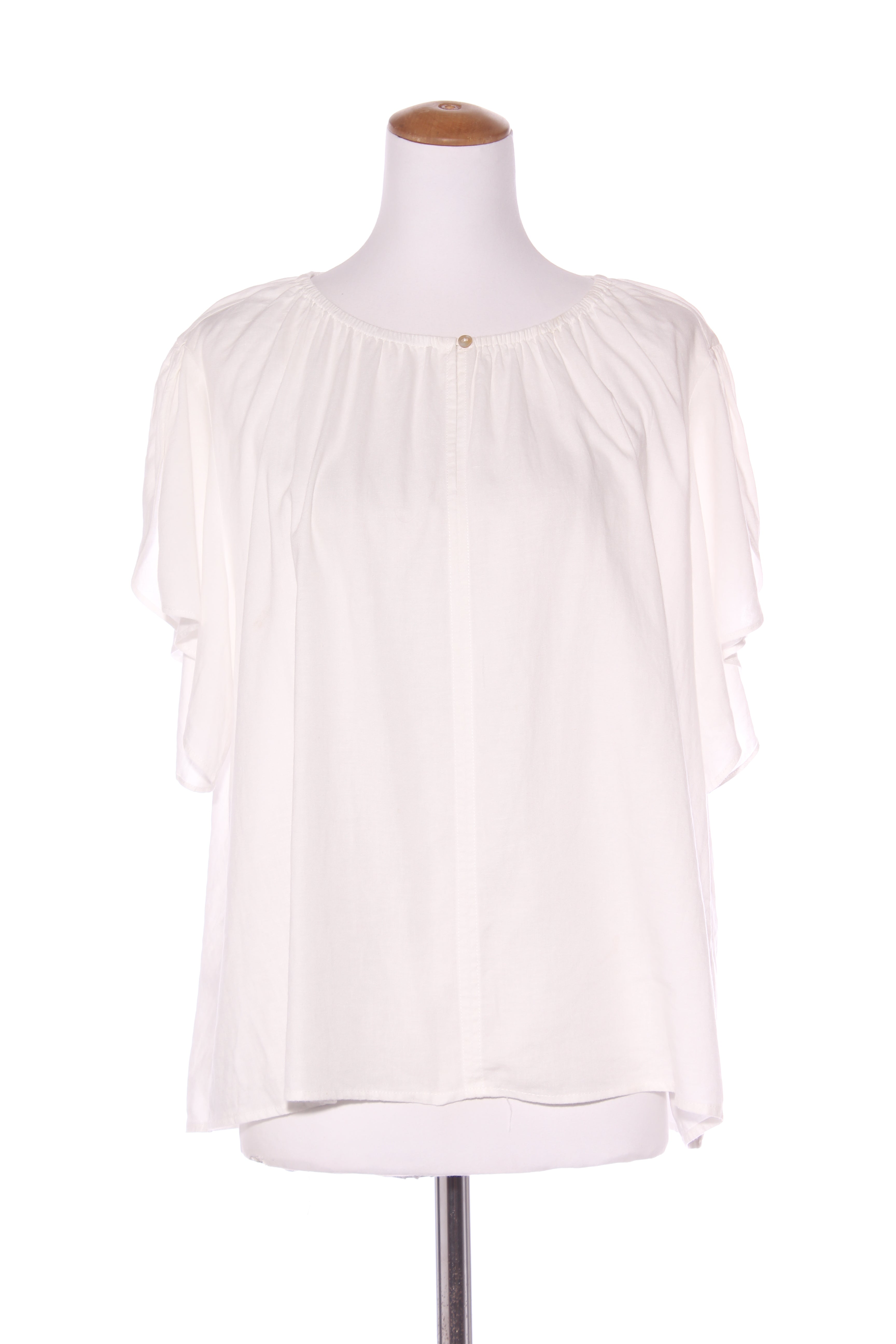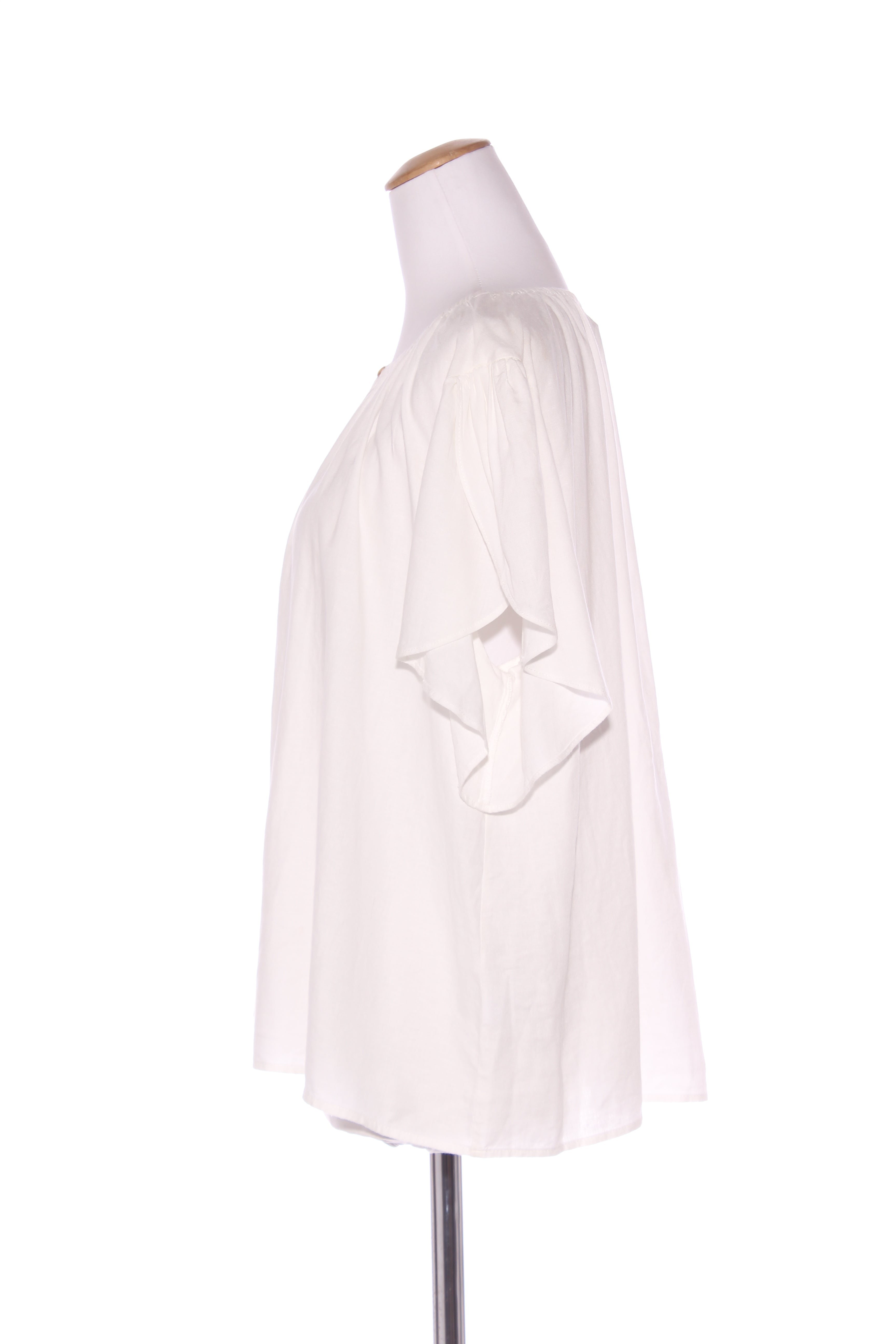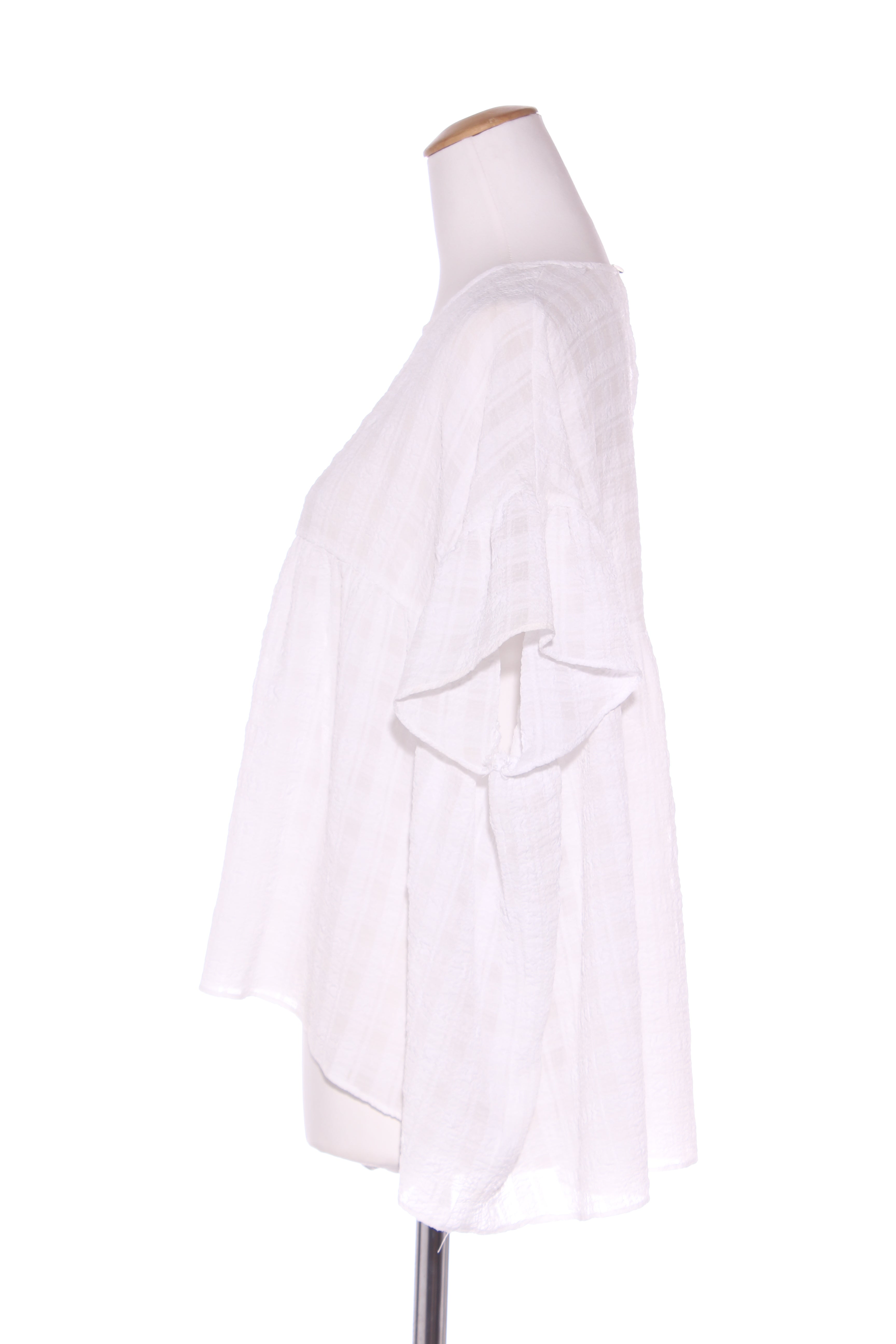 SIZE ON TAG: SFITS LIKE: 10-12COLOUR: WhiteFABRIC: 100% certified fair trade organic cottonCONDITION: Excellent prelovedMEASUREMENTS:BUST: 52cms WAIST: 64cms LENGTH: 55-57cms NOTES: Pleated back at neckline. Billow sleeves.