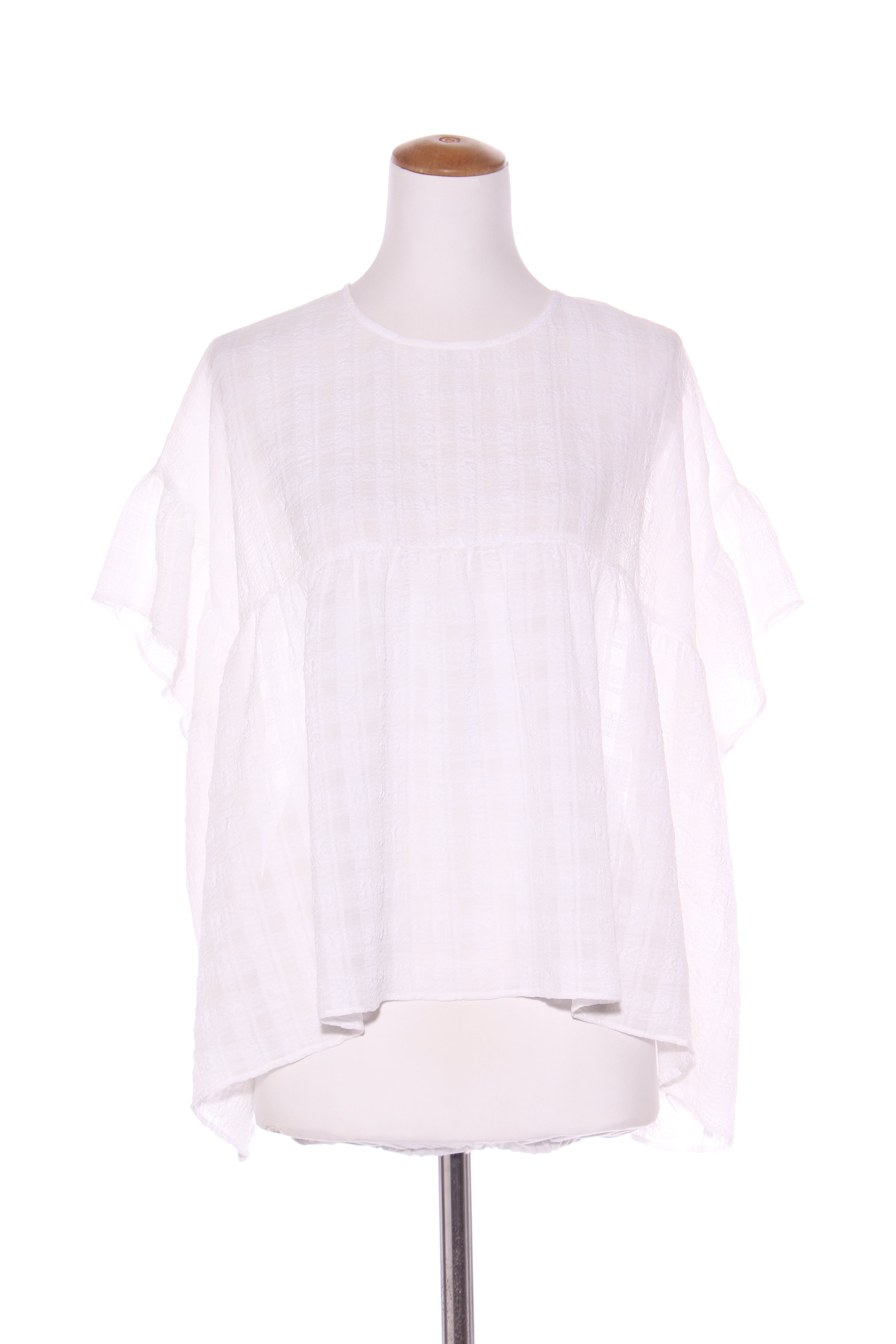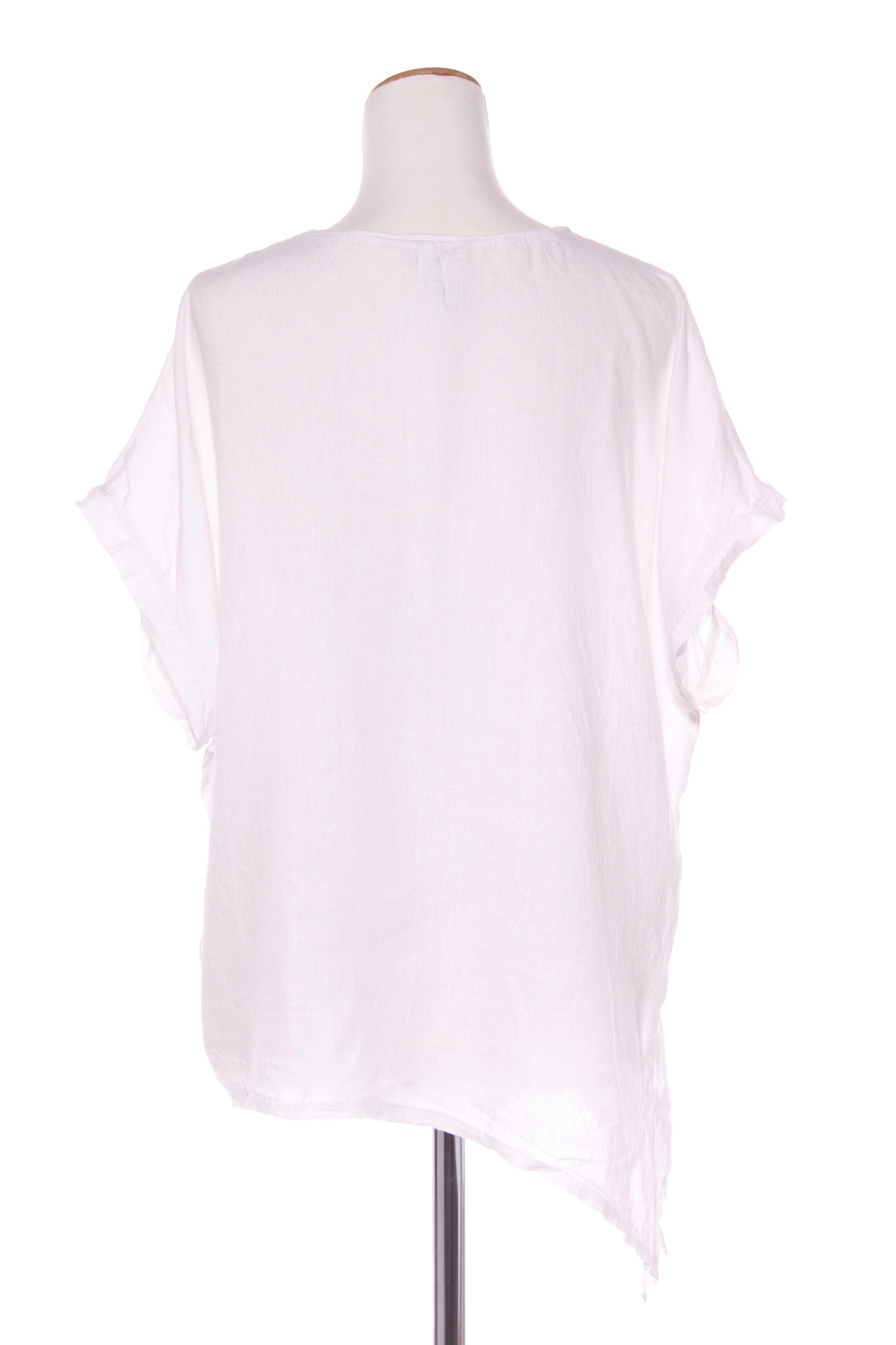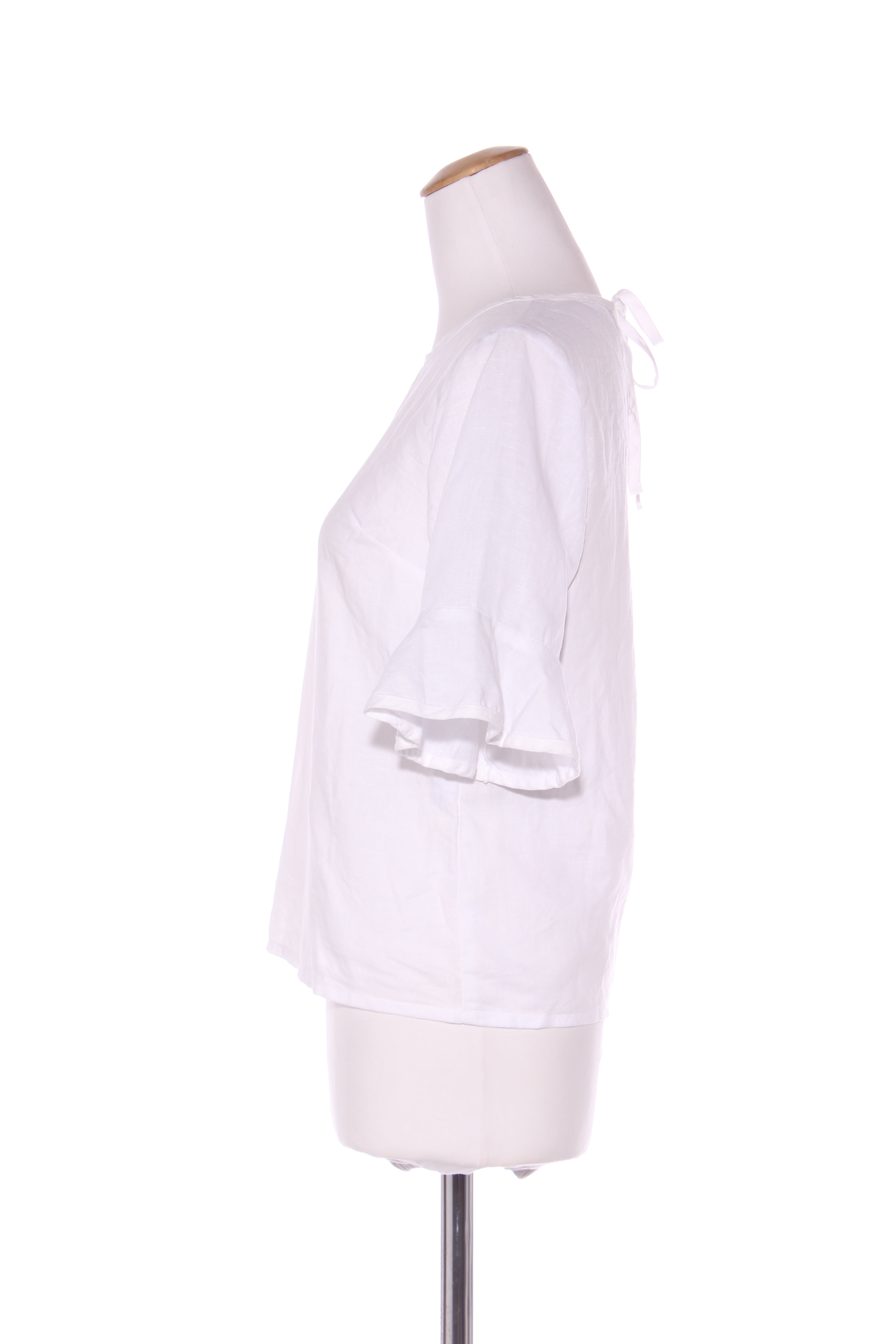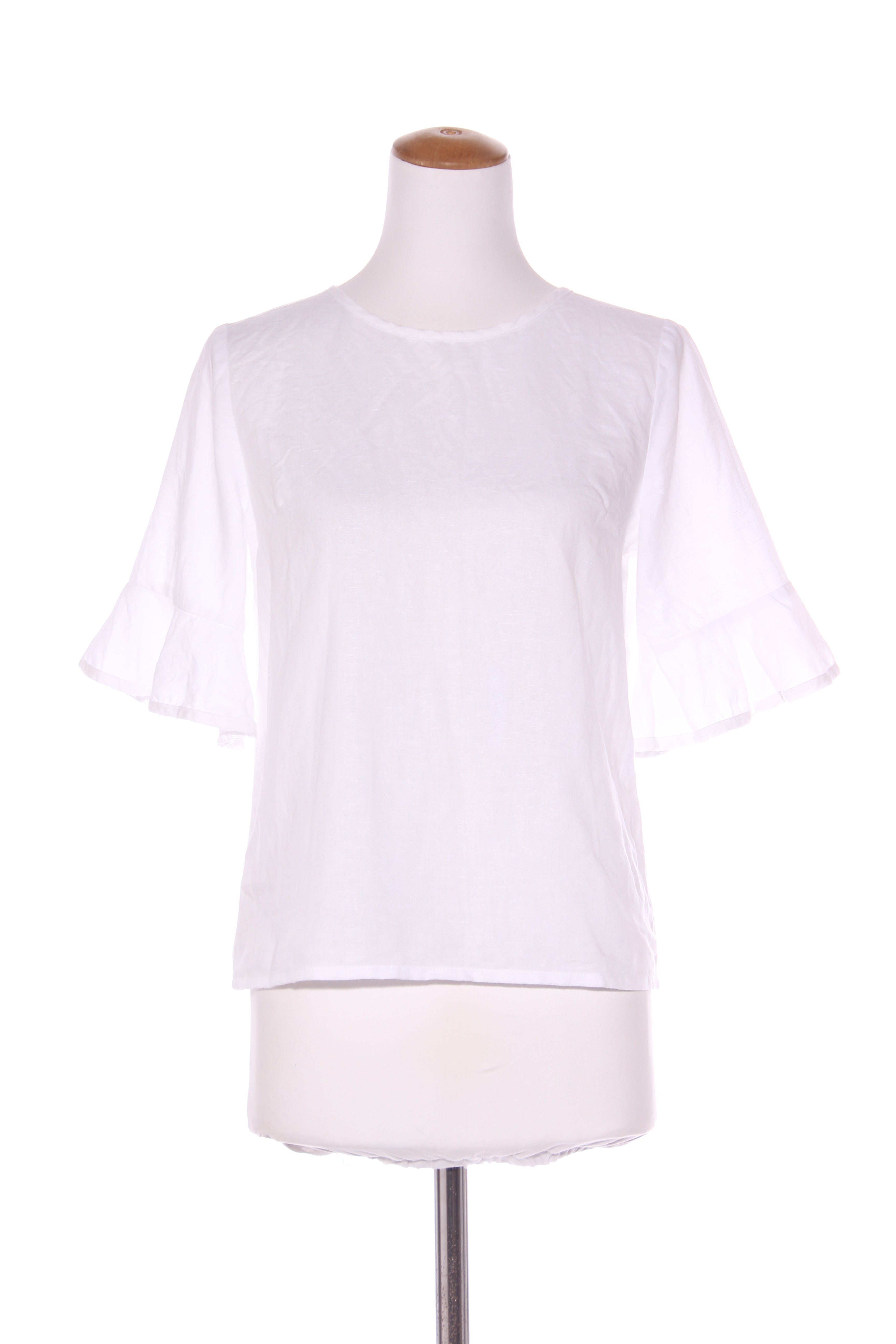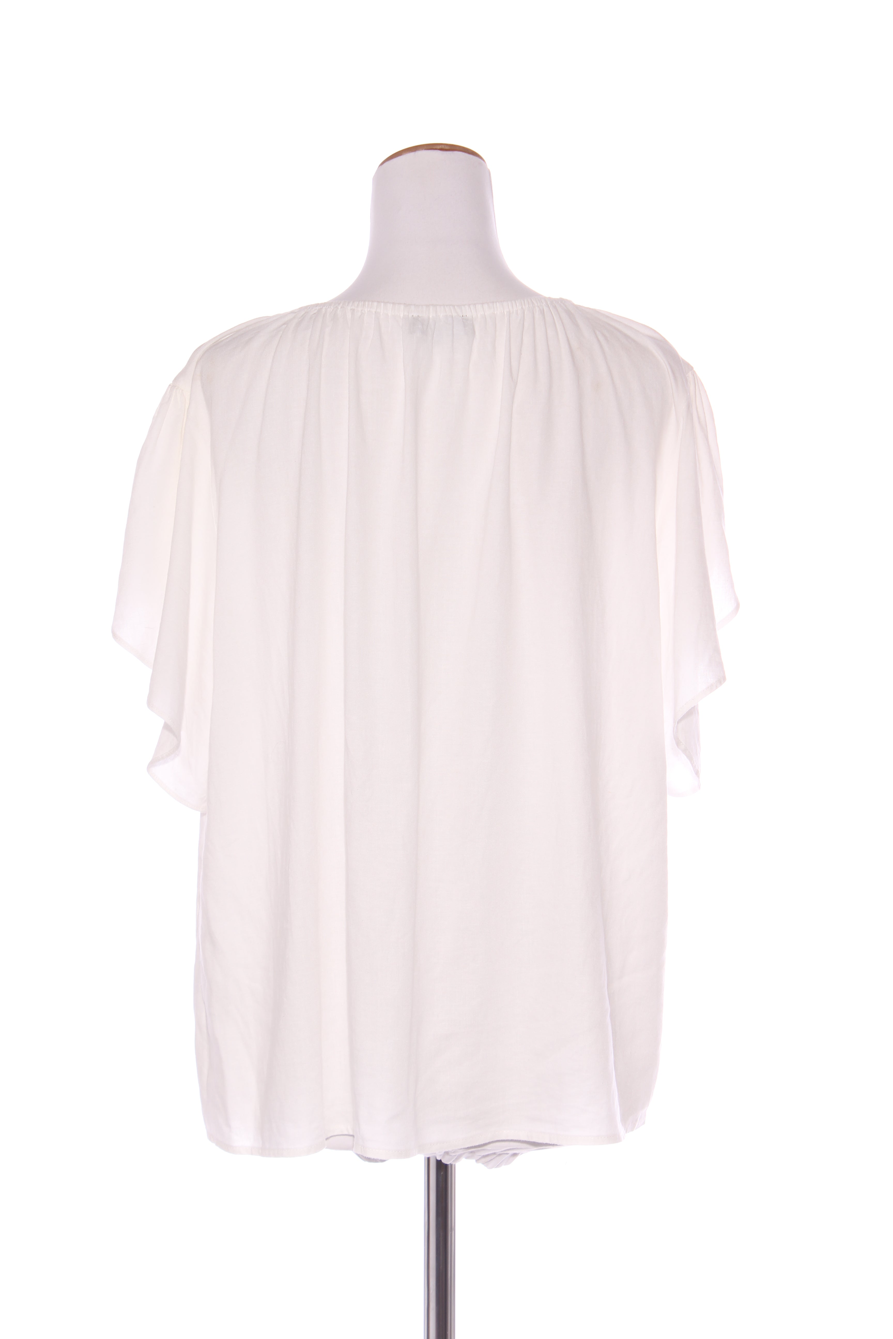 SIZE ON TAG: SFITS LIKE: 10-12COLOUR: WhiteFABRIC: 100% certified fair trade organic cottonCONDITION: Excellent prelovedMEASUREMENTS:BUST: 52cms WAIST: 64cms LENGTH: 55-57cms NOTES: Pleated back at neckline. Billow sleeves.