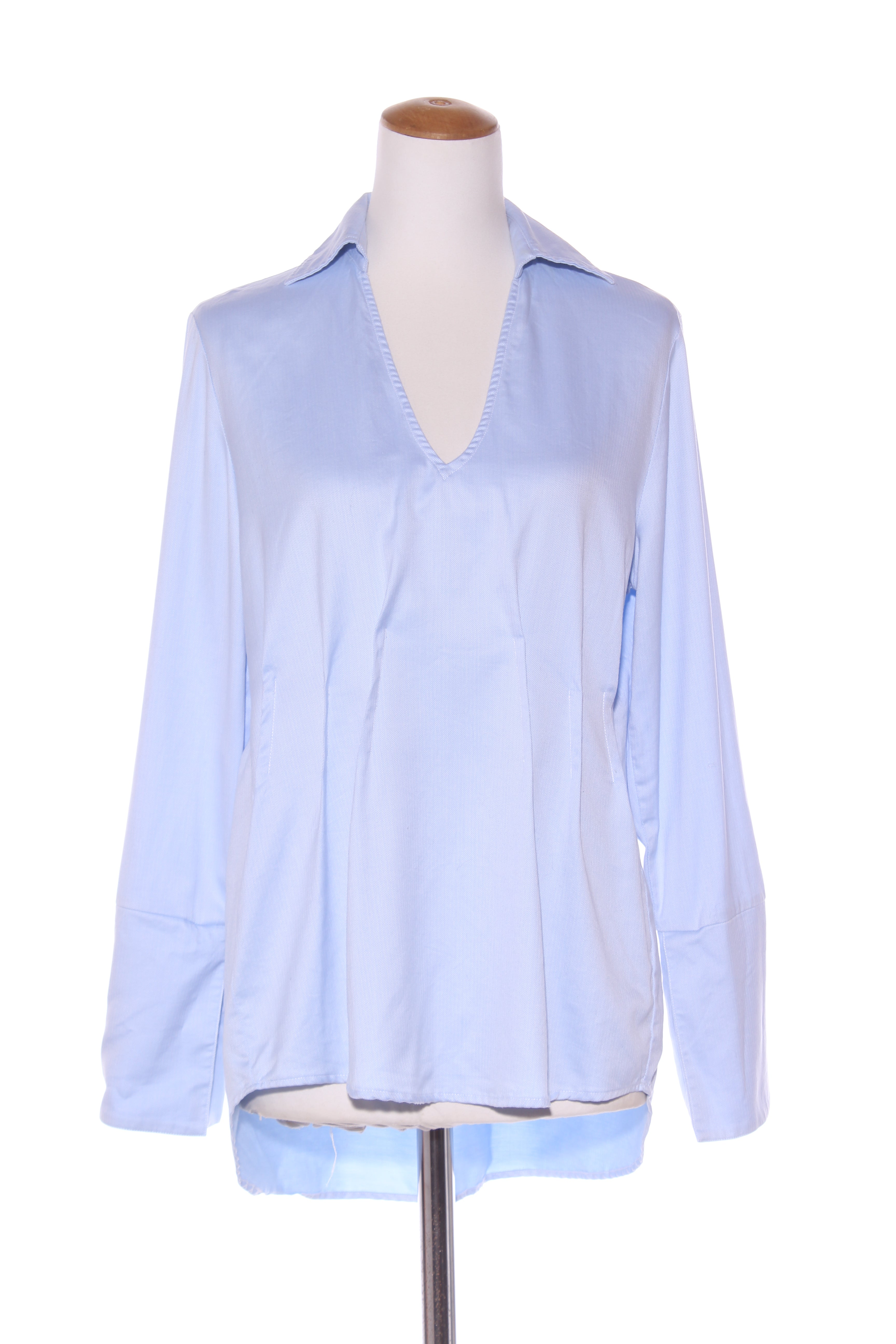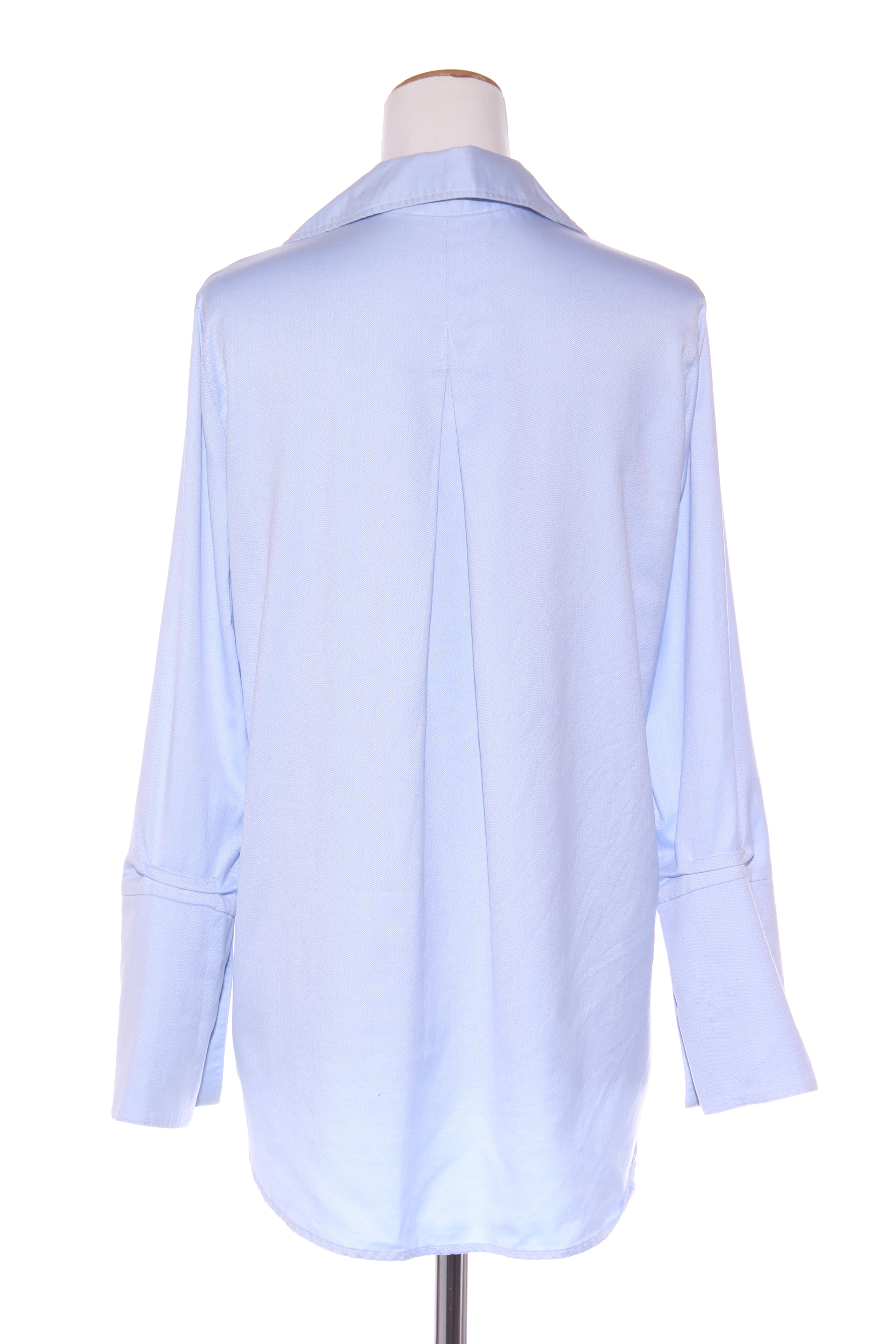 SIZE ON TAG: 14FITS LIKE: N/ACOLOUR: Washed blueFABRIC: CottonCONDITION: Excellent prelovedMEASUREMENTS:BUST: 70cms WAIST: 71cm-Free LENGTH: 68-76cmsNOTES: Cotton poplin shirt featuring striped tape trim detail beneath button...