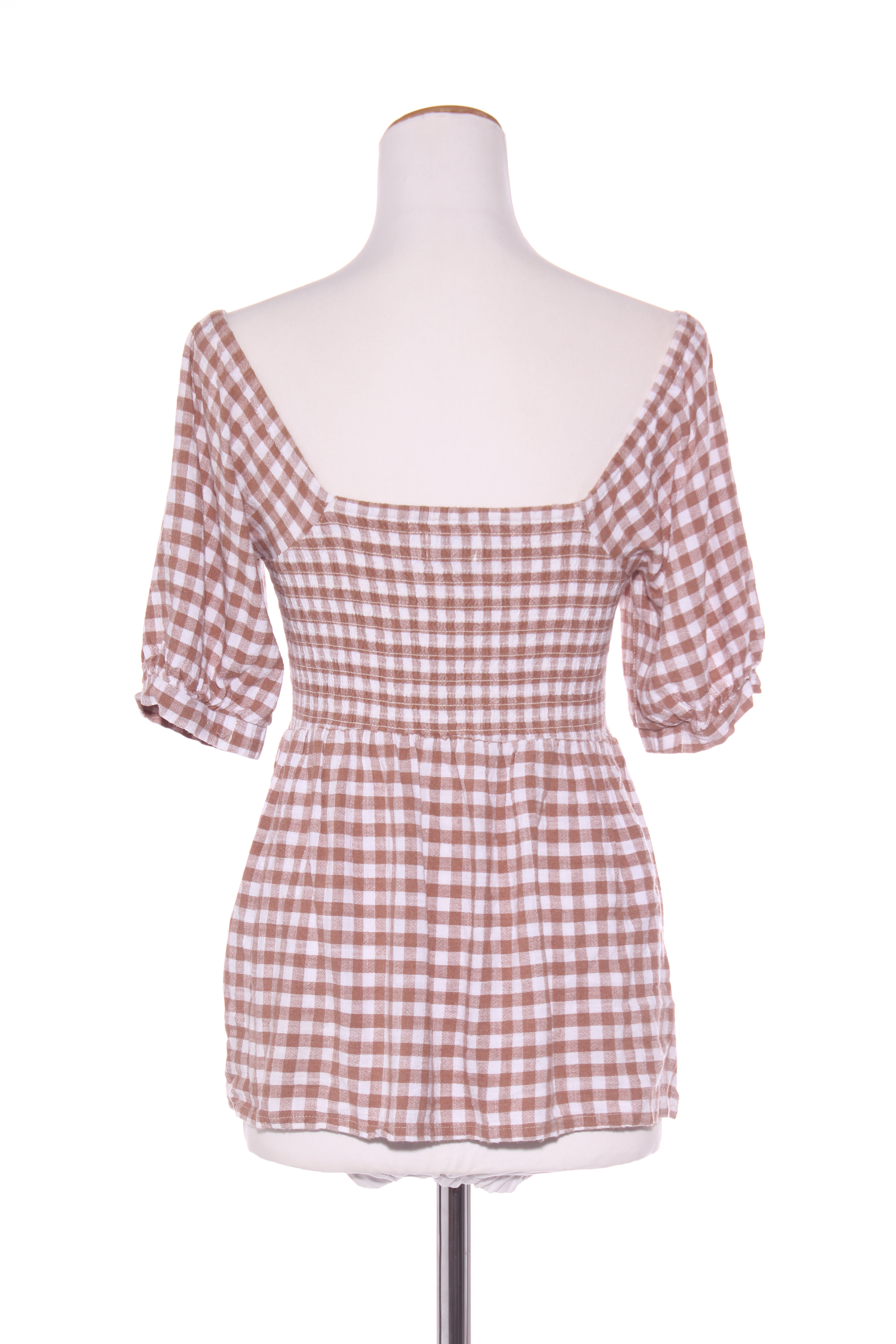 SIZE ON TAG: 12FITS LIKE: N/ACOLOUR: Brown, whiteFABRIC: Tag removed, linen/cotton?CONDITION: Excellent prelovedMEASUREMENTS:BUST: 39ms WAIST: 37cms LENGTH: 65cms NOTES: Elasticated neckline. Elasticated shirred body.