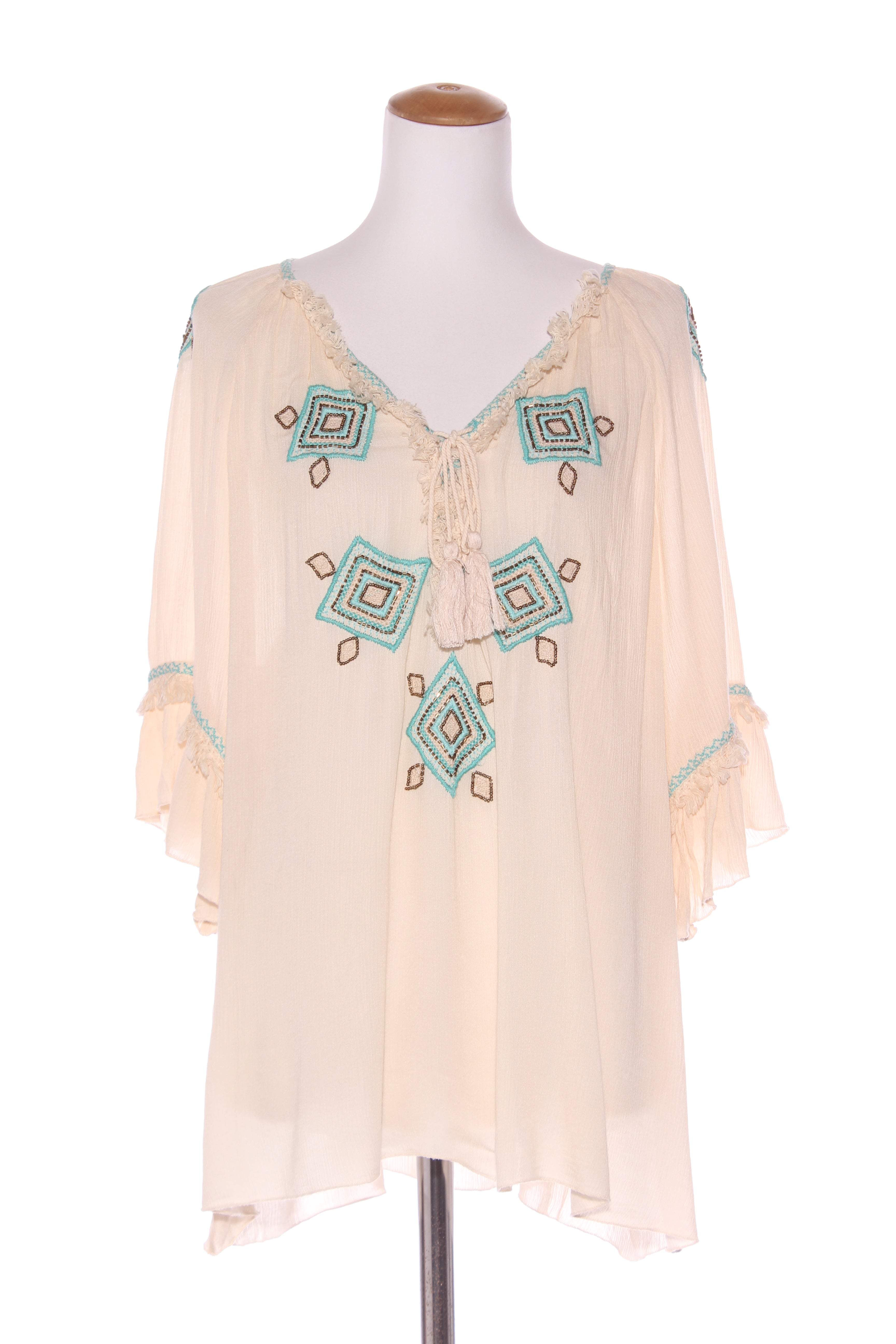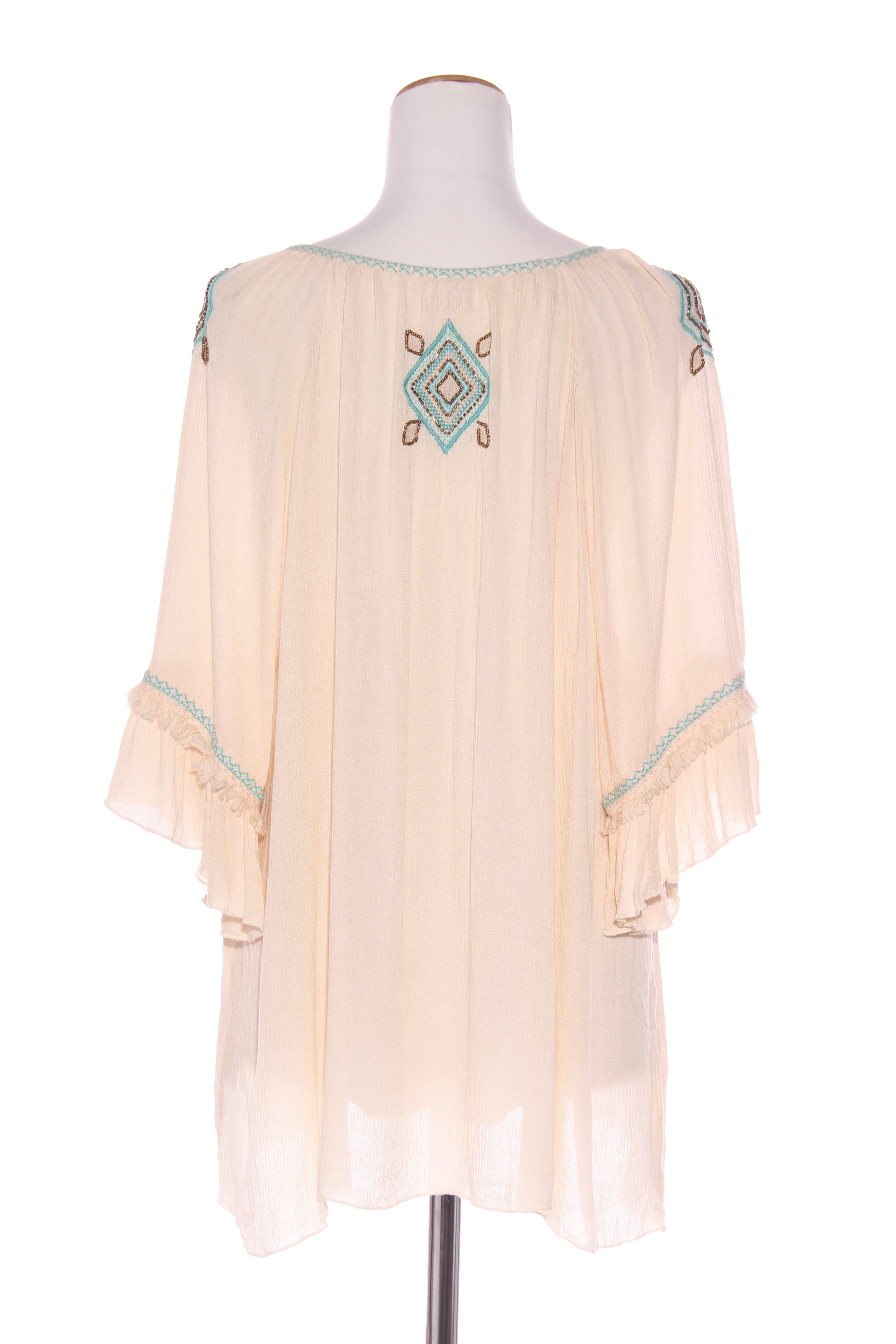SIZE ON TAG: SXFITS LIKE: 20COLOUR: Cream, blue, goldFABRIC: ViscoseCONDITION: Excellent prelovedMEASUREMENTS:BUST: 70cms WAIST: 80cms LENGTH: 72-80cmsNOTES: Lace up front with tassel tie. Ruffle sleeve ends.