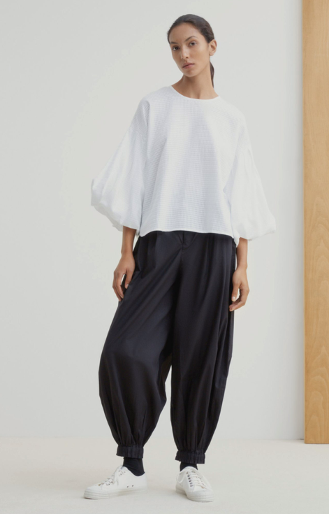 SIZE ON TAG: SFITS LIKE: 10-12COLOUR: WhiteFABRIC: 100% certified fair trade organic cottonCONDITION: Excellent prelovedMEASUREMENTS:BUST: 52cms WAIST: 64cms LENGTH: 55-57cms NOTES: Pleated back at neckline. Billow sleeves.