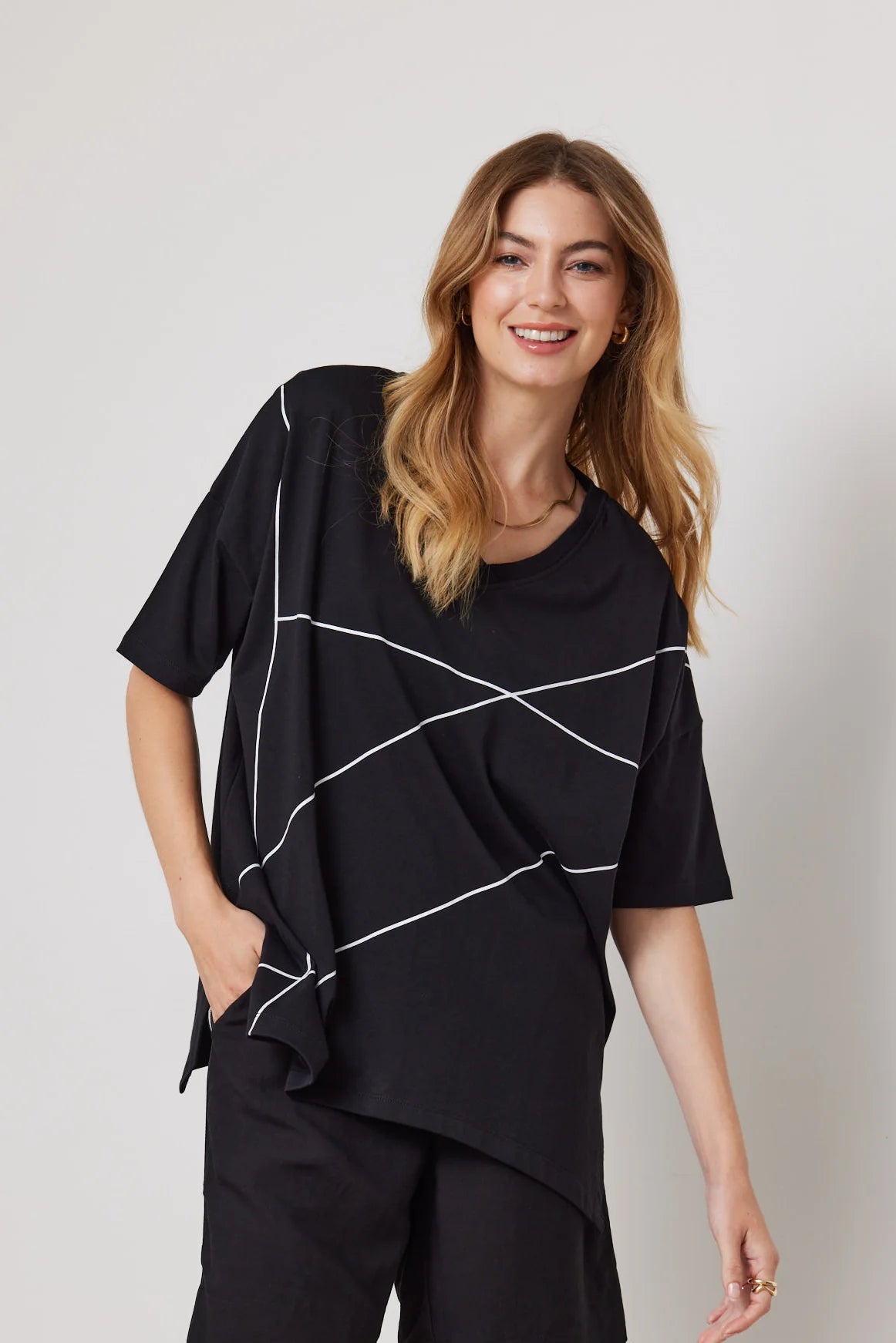 SALE ITEM - [NOT ELIGIBLE FOR RETURN] - Was $34SIZE ON TAG: 10FITS LIKE: 10-12COLOUR: Black, cream, metallic silverFABRIC: CottonCONDITION: Like newMEASUREMENTS:BUST: 62cms WAIST: 61cms LENGTH: 62-68cmsNOTES: Oversized...
