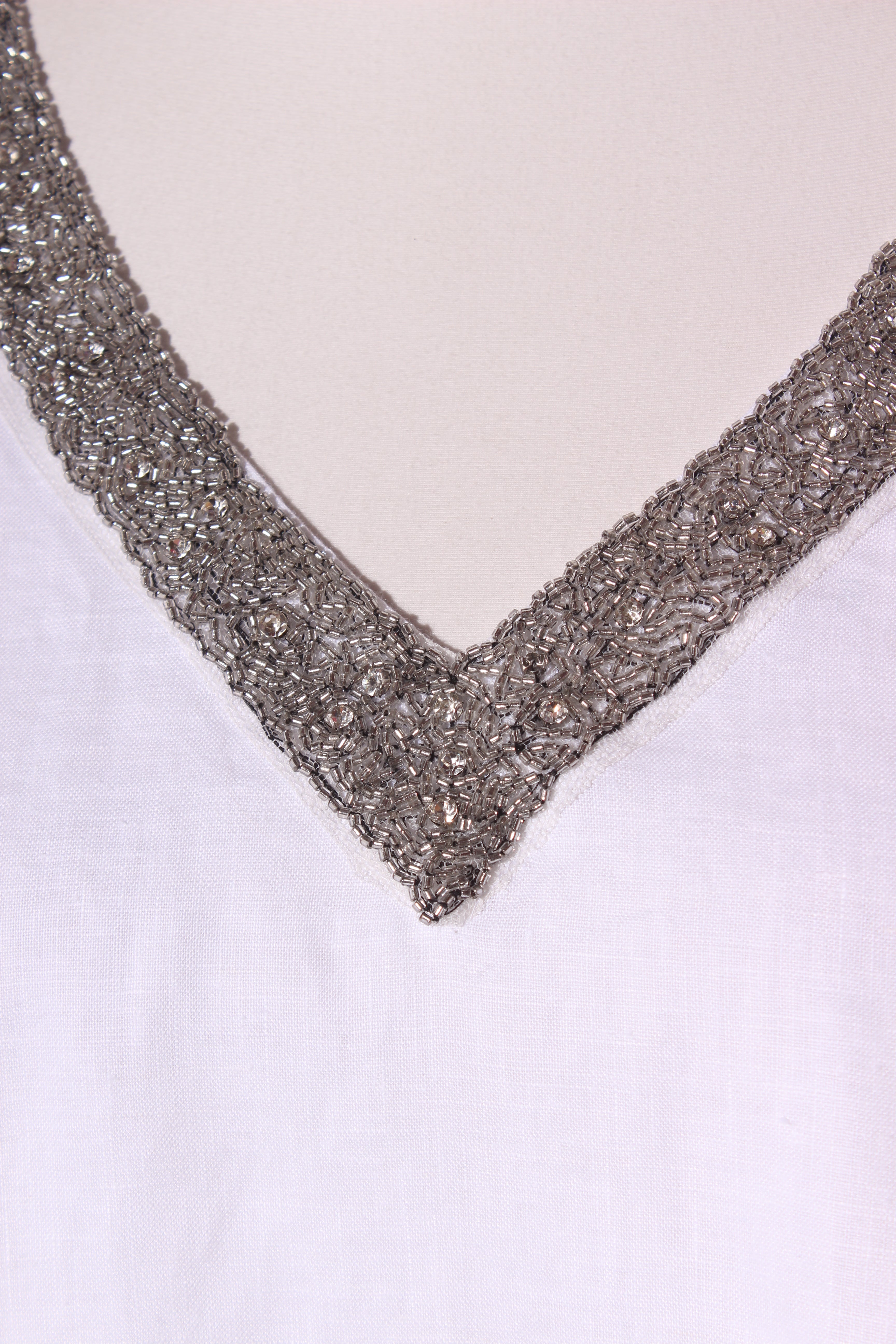 SIZE ON TAG: 44FITS LIKE: 14-16COLOUR: White, silverFABRIC: LinenCONDITION: Like newMEASUREMENTS:BUST: 61cms WAIST: 59cms LENGTH: 77cmsNOTES: Beaded neckline with diamontee embellishments. Button up nape of neck. ...