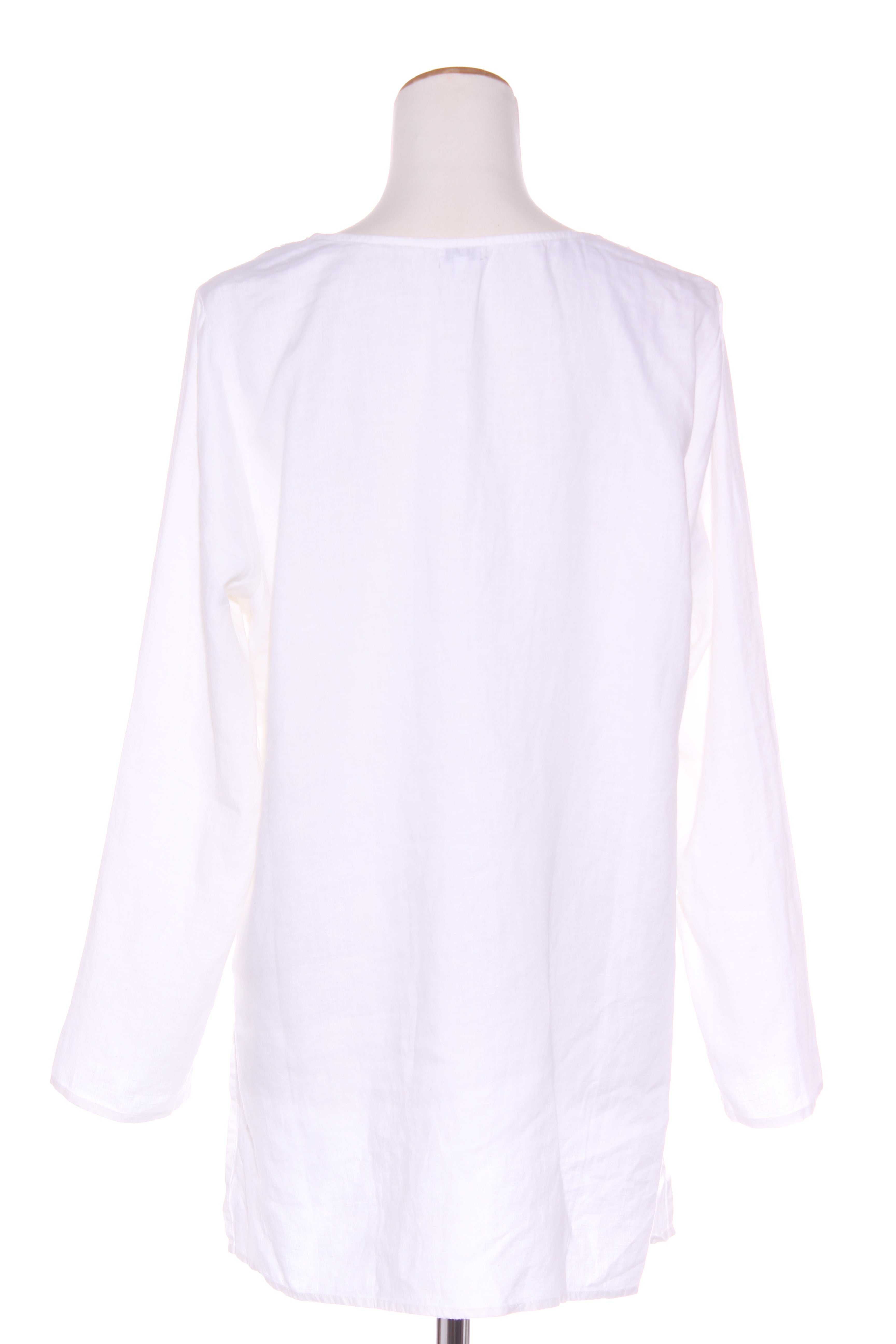 SIZE ON TAG: Tag removedFITS LIKE: 12-16COLOUR: WhiteFABRIC: 50% linen, 50% cottonCONDITION: Like newMEASUREMENTS:BUST: 78cms WAIST: Free LENGTH: 61-70cms NOTES: Elasticated neckline with button up front. Fabric...