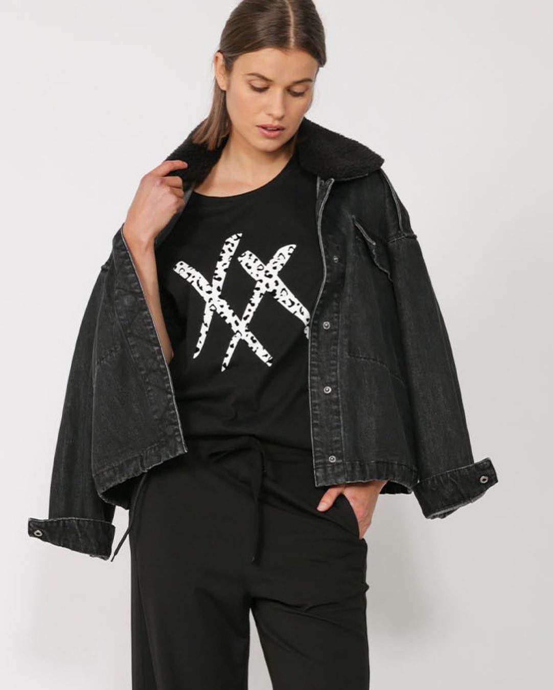 SIZE ON TAG: SFITS LIKE: 10COLOUR: Black, whiteFABRIC: CottonCONDITION: Excellent prelovedMEASUREMENTS:BUST: 51cms WAIST: 49cms LENGTH: 66cms NOTES: Velvet flocked leopard print XX front. Fabric has stretch.