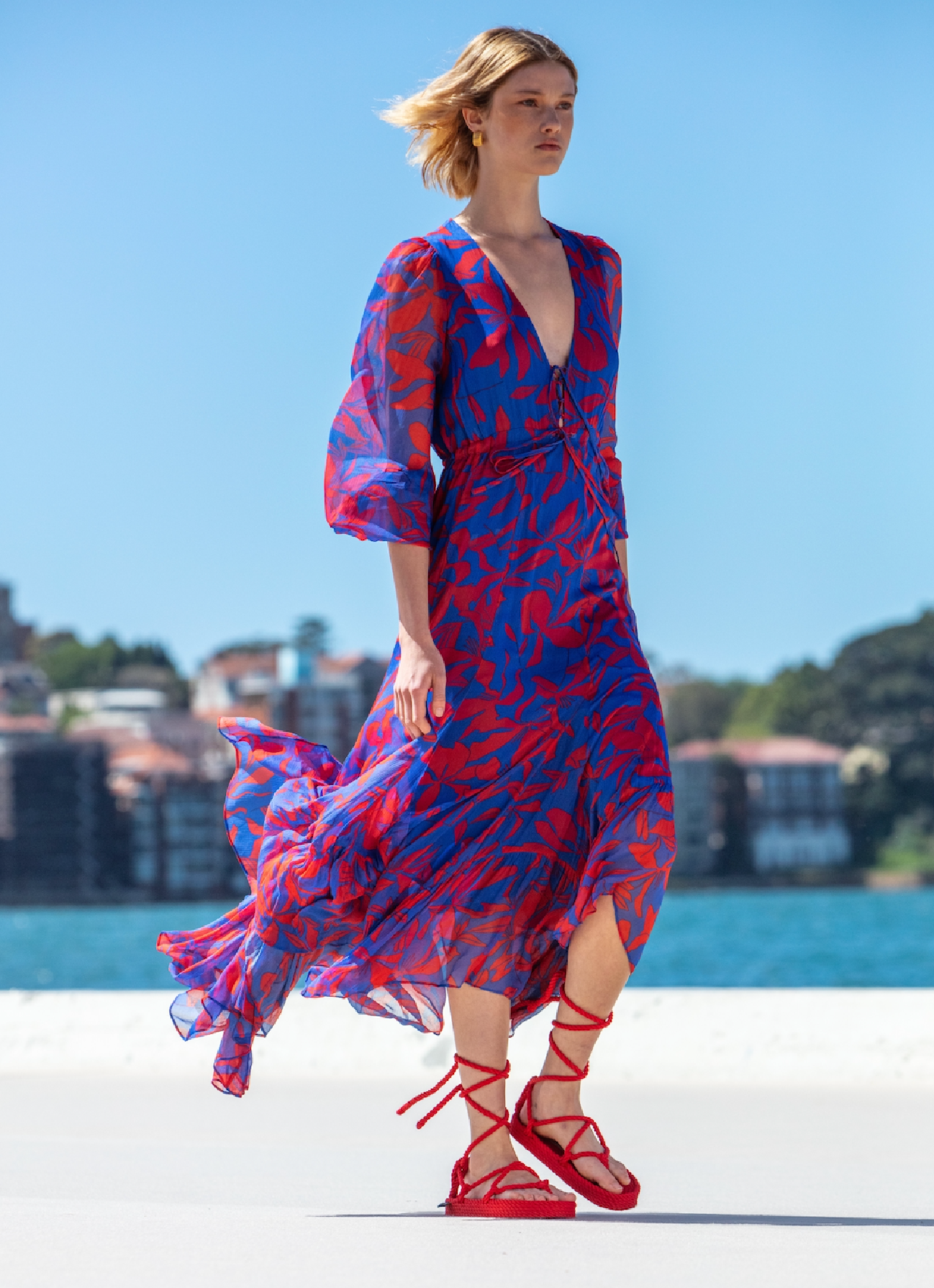 SIZE ON TAG: MFITS LIKE: 12COLOUR: Blue, red, multiFABRIC: ViscoseCONDITION: Excellent prelovedMEASUREMENTS:BUST: 54cms WAIST: 60cms LENGTH: 103-115cms NOTES: "Rose at dawn - Frill some more" Pre-Fall...