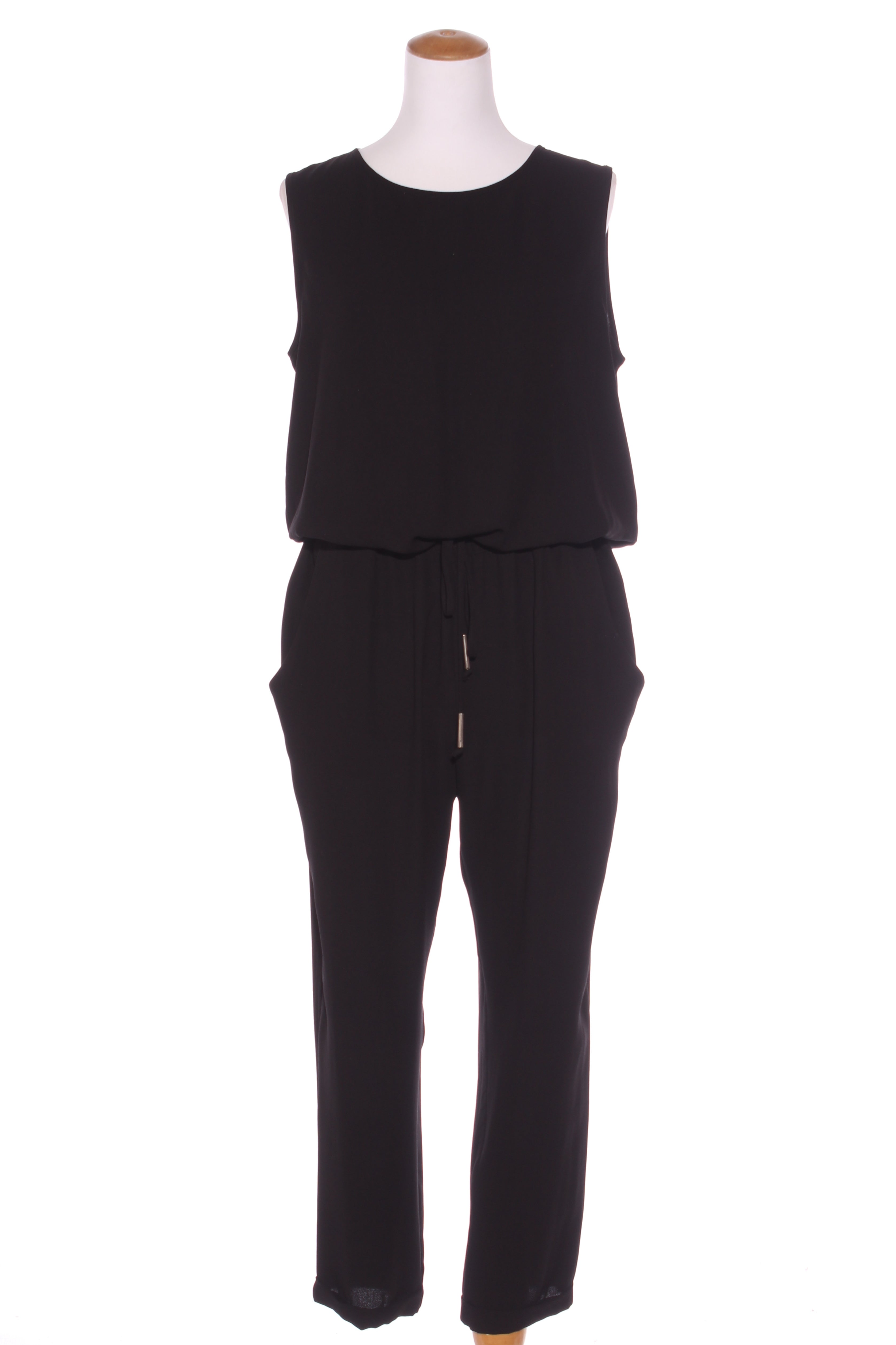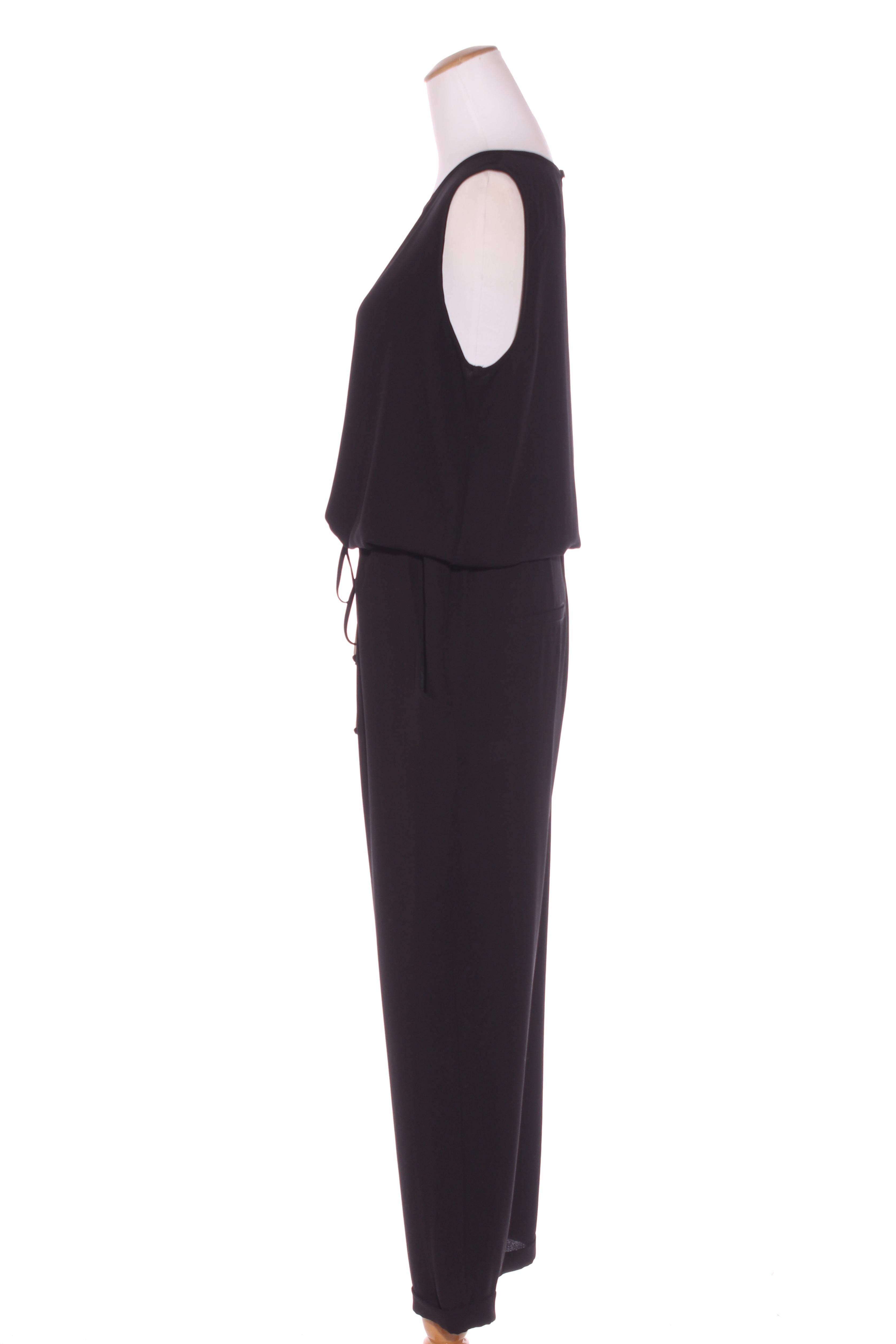 SIZE ON TAG: 12FITS LIKE: N/ACOLOUR: BlackFABRIC: Polyester crepe, Lining - acetateCONDITION: Excellent prelovedMEASUREMENTS:BUST: 57cms WAIST: 52cms LENGTH: 148cmsNOTES: Made in NZ. Drawstring through waist. Side pockets.