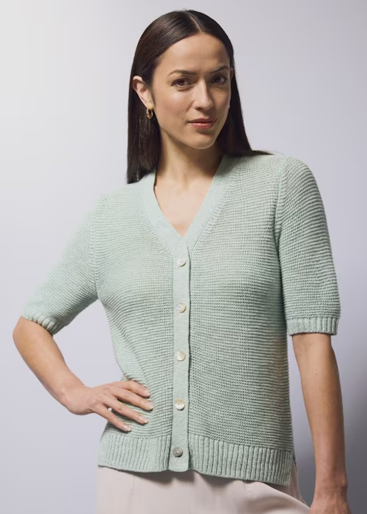 SIZE ON TAG: 2XLFITS LIKE: 18COLOUR: Greeny blueFABRIC: 55% linen, 45% cottonCONDITION: Like newMEASUREMENTS:BUST: 62cms WAIST: 60cms LENGTH: 59cmsNOTES: This short sleeve cardigan is made from...