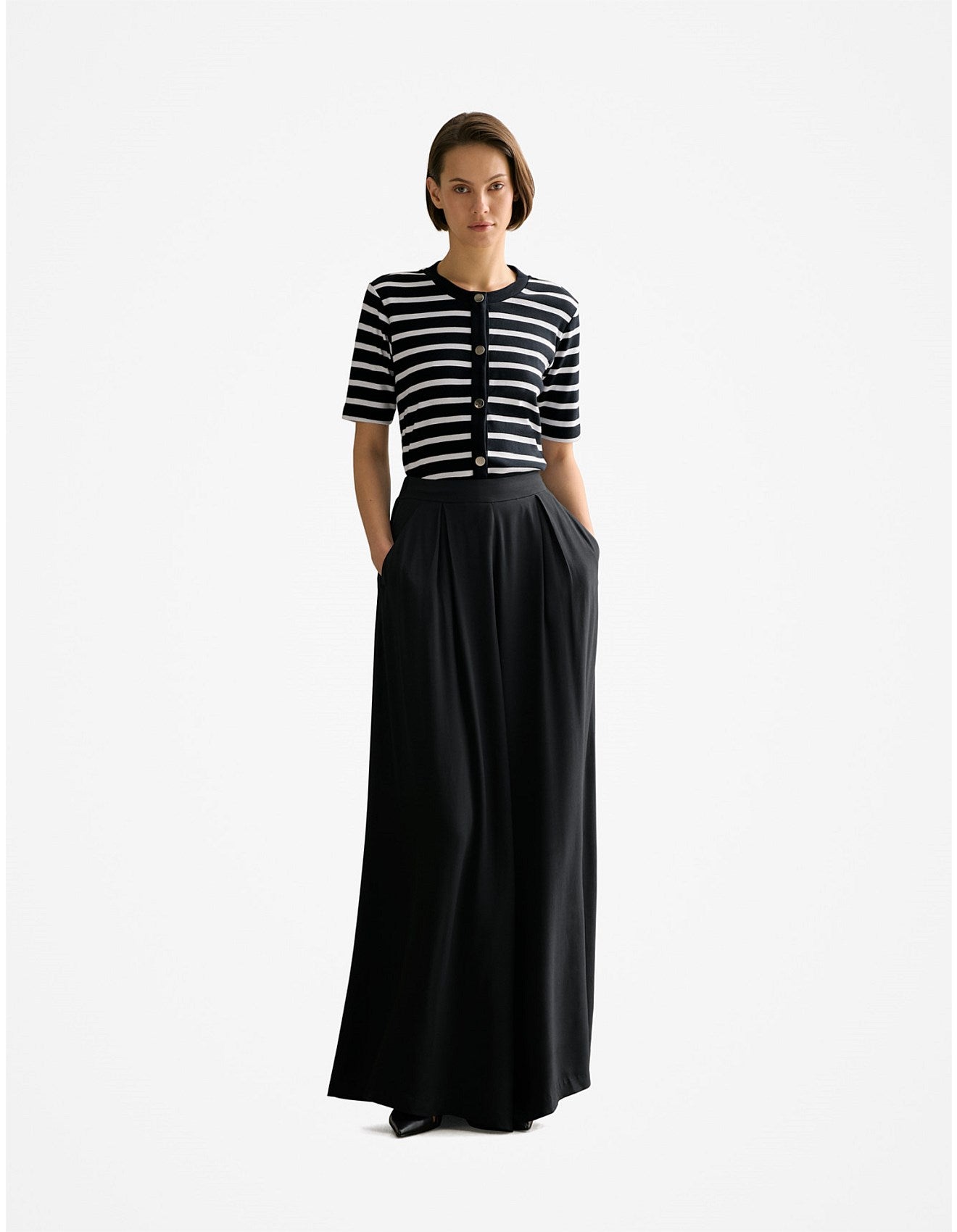 SIZE ON TAG: MFITS LIKE: 12COLOUR: Black, whiteFABRIC: CottonCONDITION: Like newMEASUREMENTS:BUST: 53cms WAIST: 51cms LENGTH: 58cmsNOTES: Our short-sleeved cardigan top is crafted from soft Australian cotton....